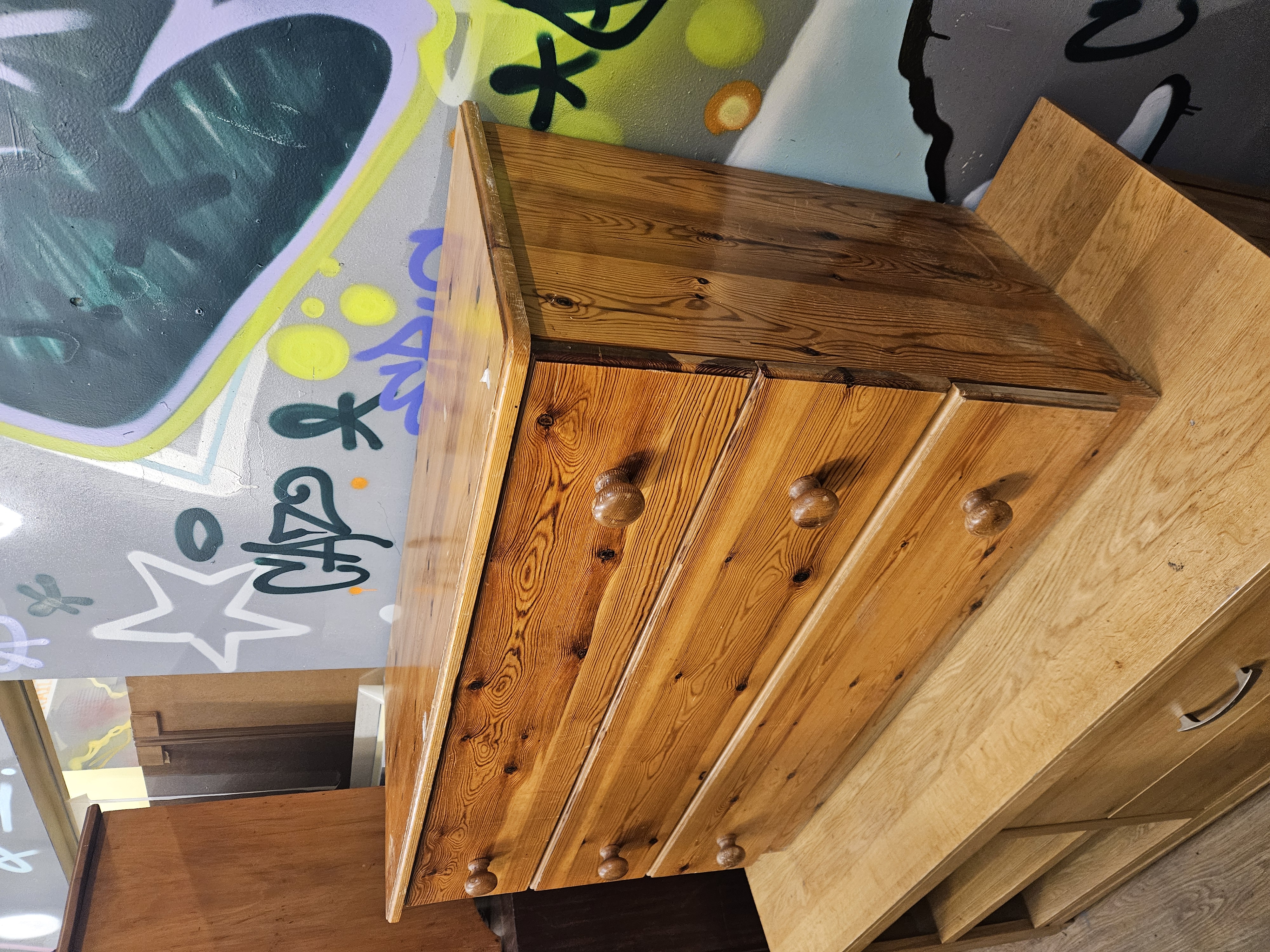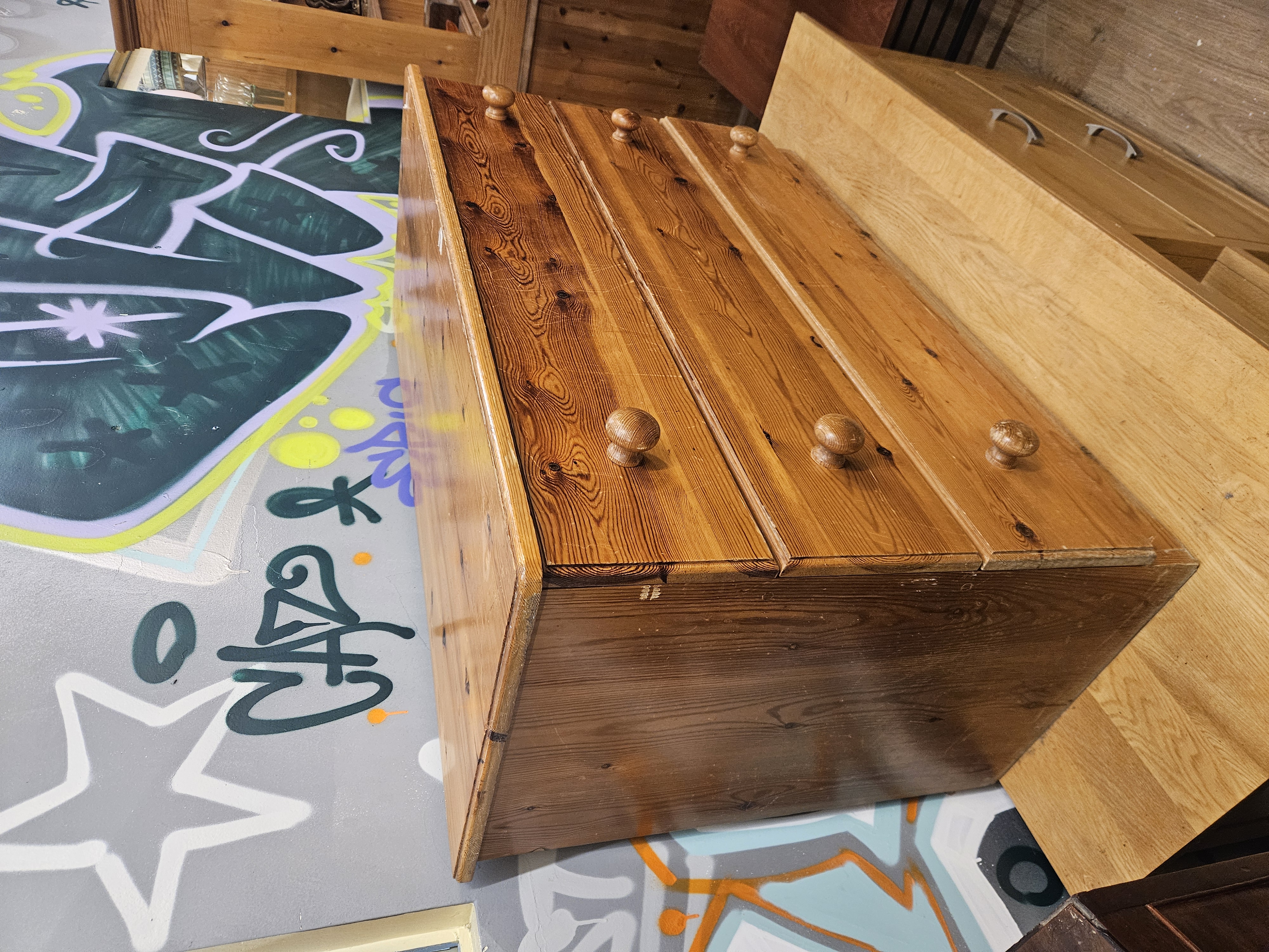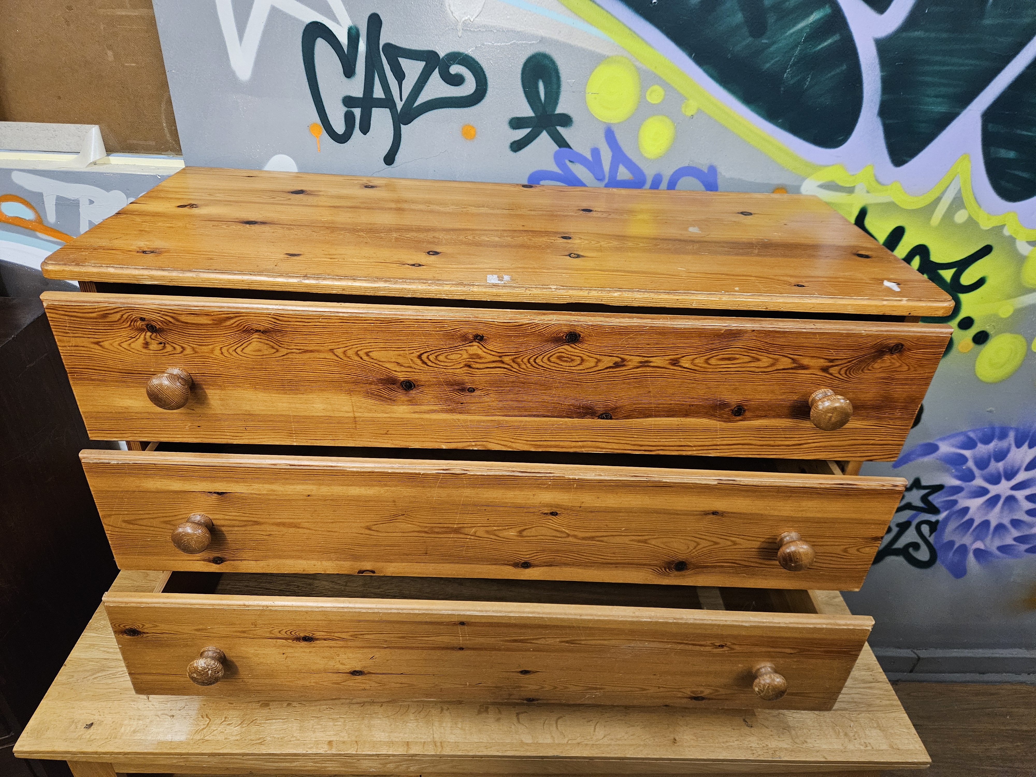A contemporary three-drawer chest of drawers constructed from solid pine. The piece features a rectangular top and side panels with rounded front corners. The pine timber is characterised by a prominent grain and frequent natural knots throughout the exterior surfaces. The chest contains three full-width drawers, each fitted with two turned wooden pine pull knobs. The secondary wood used for the drawer sides and internal components is also pine. No maker marks, labels, or stamps are visible on the exterior or the visible portions of the drawer interiors.