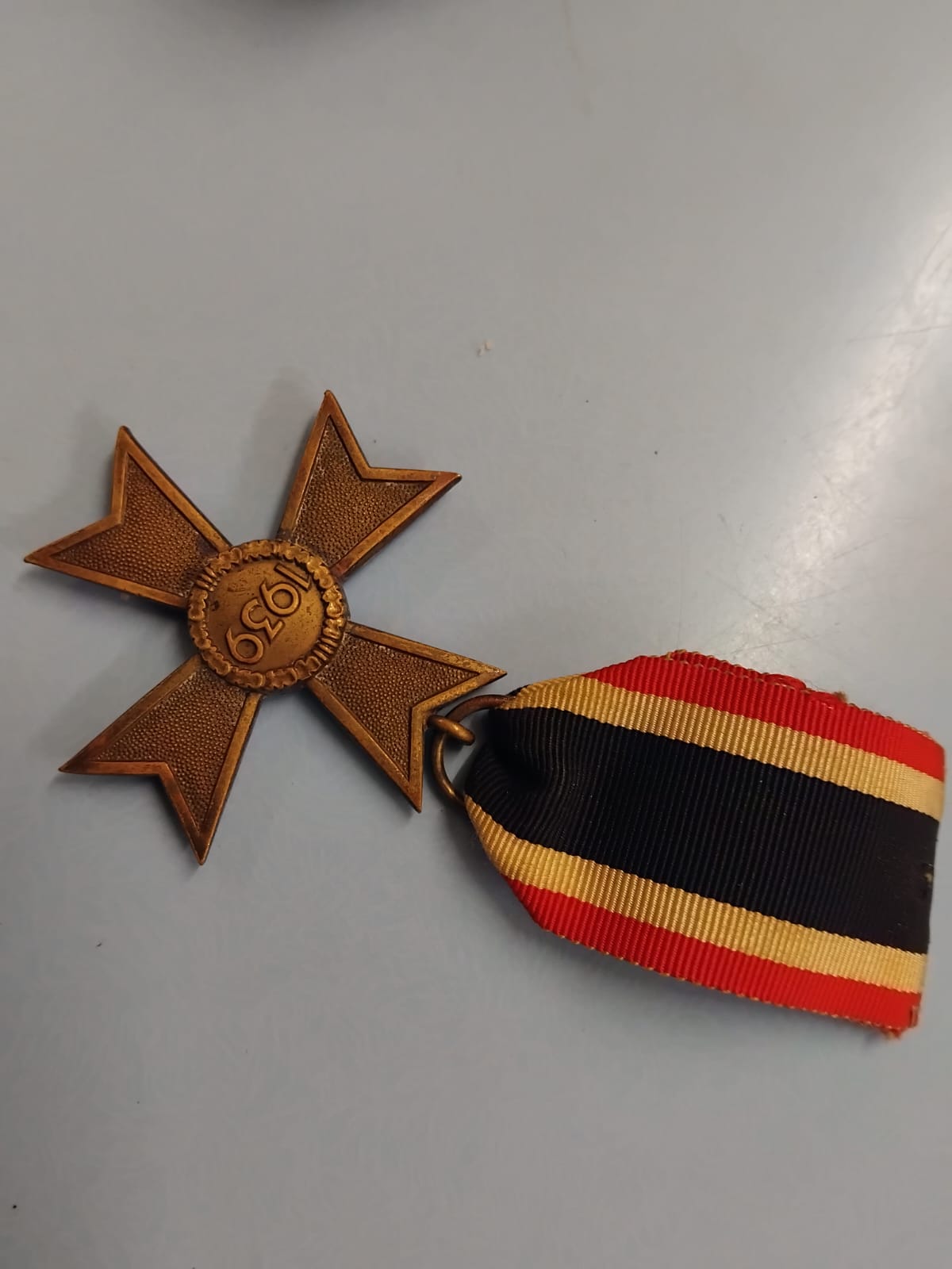 A German War Merit Cross, 2nd Class, without Swords (Kriegsverdienstkreuz 2. Klasse ohne Schwerter). The award is a die-struck Maltese cross manufactured from a bronze-washed metal alloy, consistent with mid-to-late war zinc production. The side shown features a central circular oak leaf wreath containing the raised date 1939 on a flat field. The arms of the cross are finished with a pebbled texture within raised, polished borders. The medal is suspended via a circular ring from a tricolour ribbon featuring a wide central black stripe flanked by narrow white stripes and red edges. No manufacturer marks or stamps are visible on the suspension ring or the body of the medal.