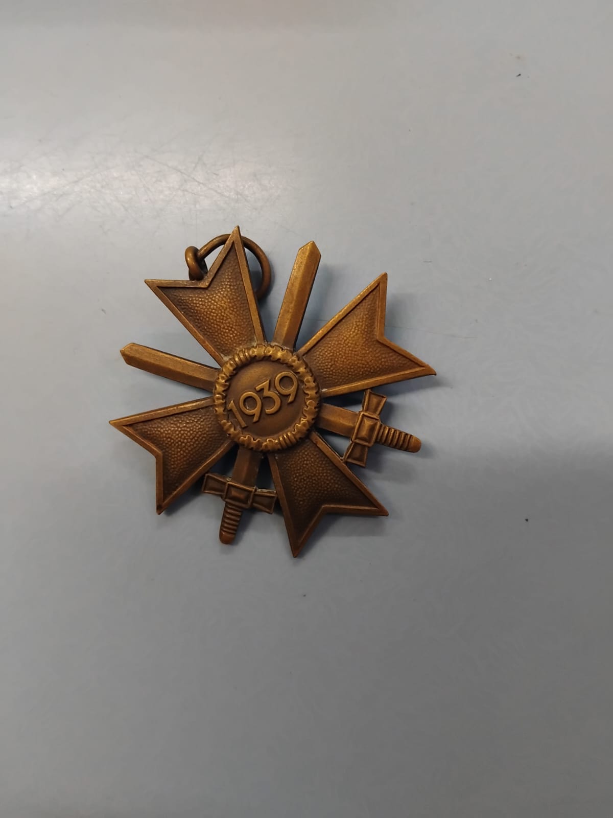 A German Second World War period War Merit Cross 2nd Class with Swords (Kriegsverdienstkreuz 2. Klasse mit Schwertern). The award is designed as a Maltese cross with pebbled arms and two crossed swords positioned between the arms. The centre features a circular medallion with a raised oak leaf border. The reverse medallion displays the date 1939 in raised numerals. The obverse typically features a raised swastika within the central medallion. The item is constructed from a bronze-toned metal, consistent with bronze-washed zinc or tombak alloy production. It retains its original suspension loop and ring. No manufacturer marks are visible on the suspension ring or the body of the cross.