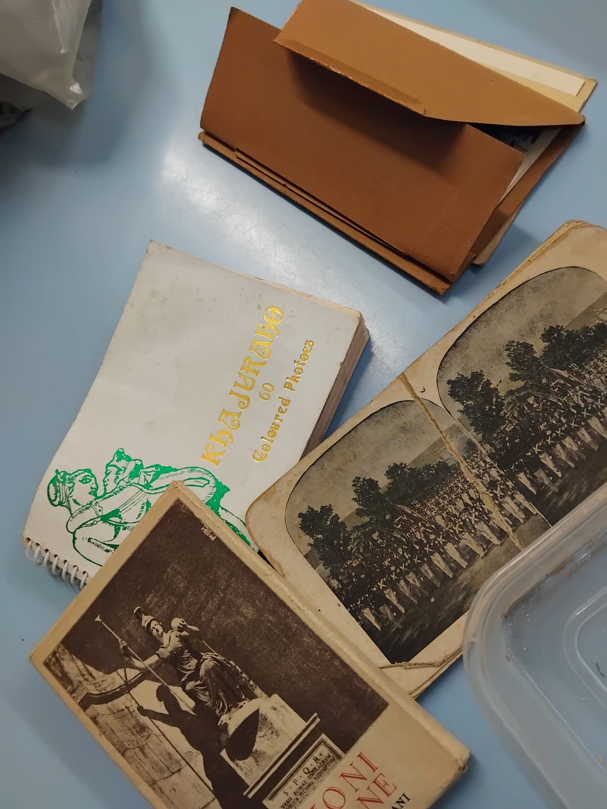 This collection comprises an assortment of mid-20th century travel memorabilia and photographic items. The first item is a spiral-bound souvenir album titled Khajuraho, featuring gold-coloured lettering and a green graphic of an Indian sculptural figure on a white card cover. It contains 60 colour photographs depicting the Nagara-style architecture and sculptures of the Khajuraho Group of Monuments in Madhya Pradesh, India. The second item is a souvenir booklet of Rome, Italy, featuring a sepia-toned cover image of a classical statue and the S.P.Q.R. (Senatus Populusque Romanus) crest. The title text in red-brown is partially legible as Visioni Romane. The third item is a sepia-toned stereoview card depicting a large outdoor military gathering with uniformed figures in formation before a treeline, marked with a small numeral 6 at the top centre. The final item is a brown paper folder containing a quantity of loose black and white photographic prints, appearing to be personal snapshots and travel photography from the period.