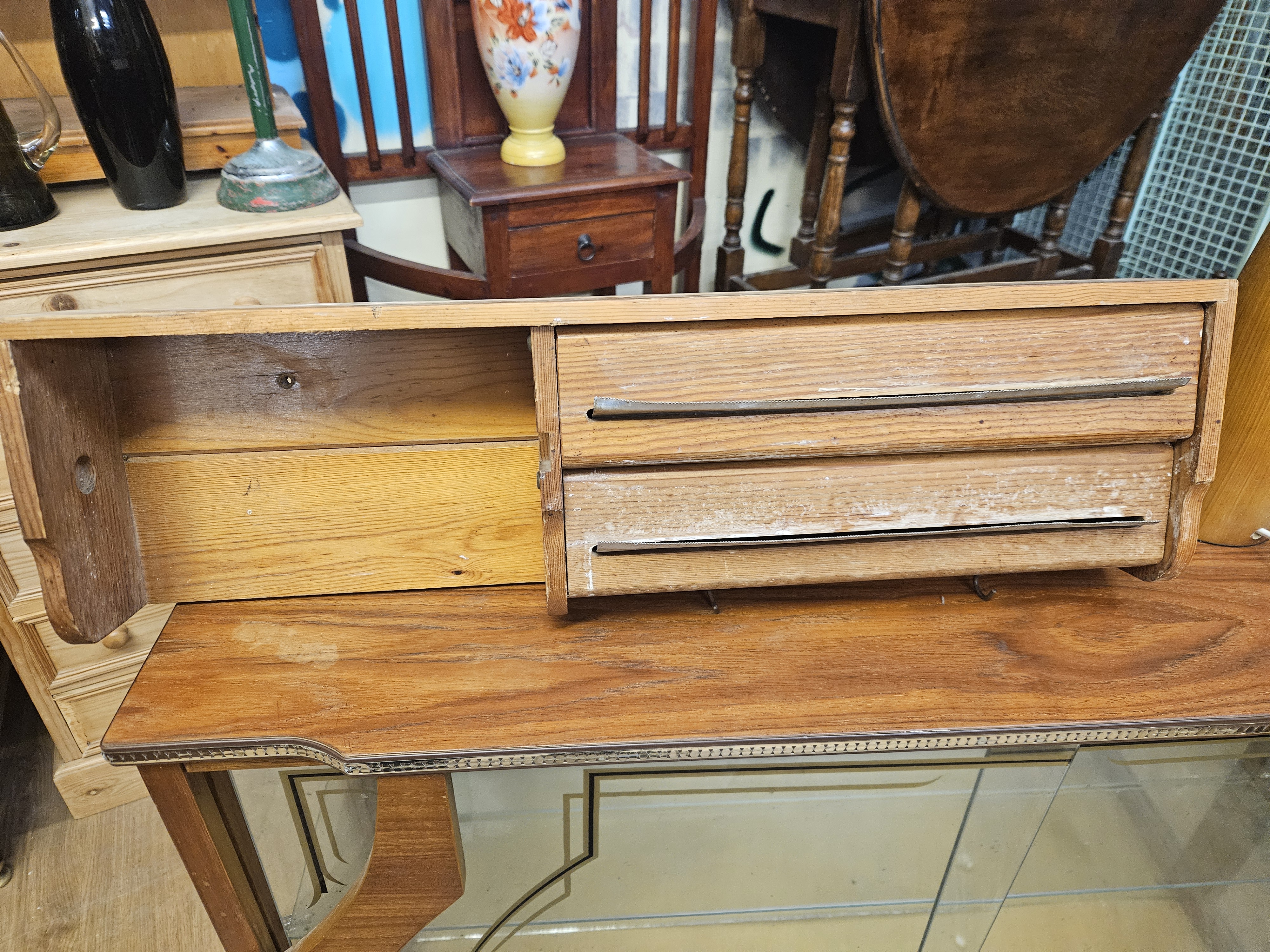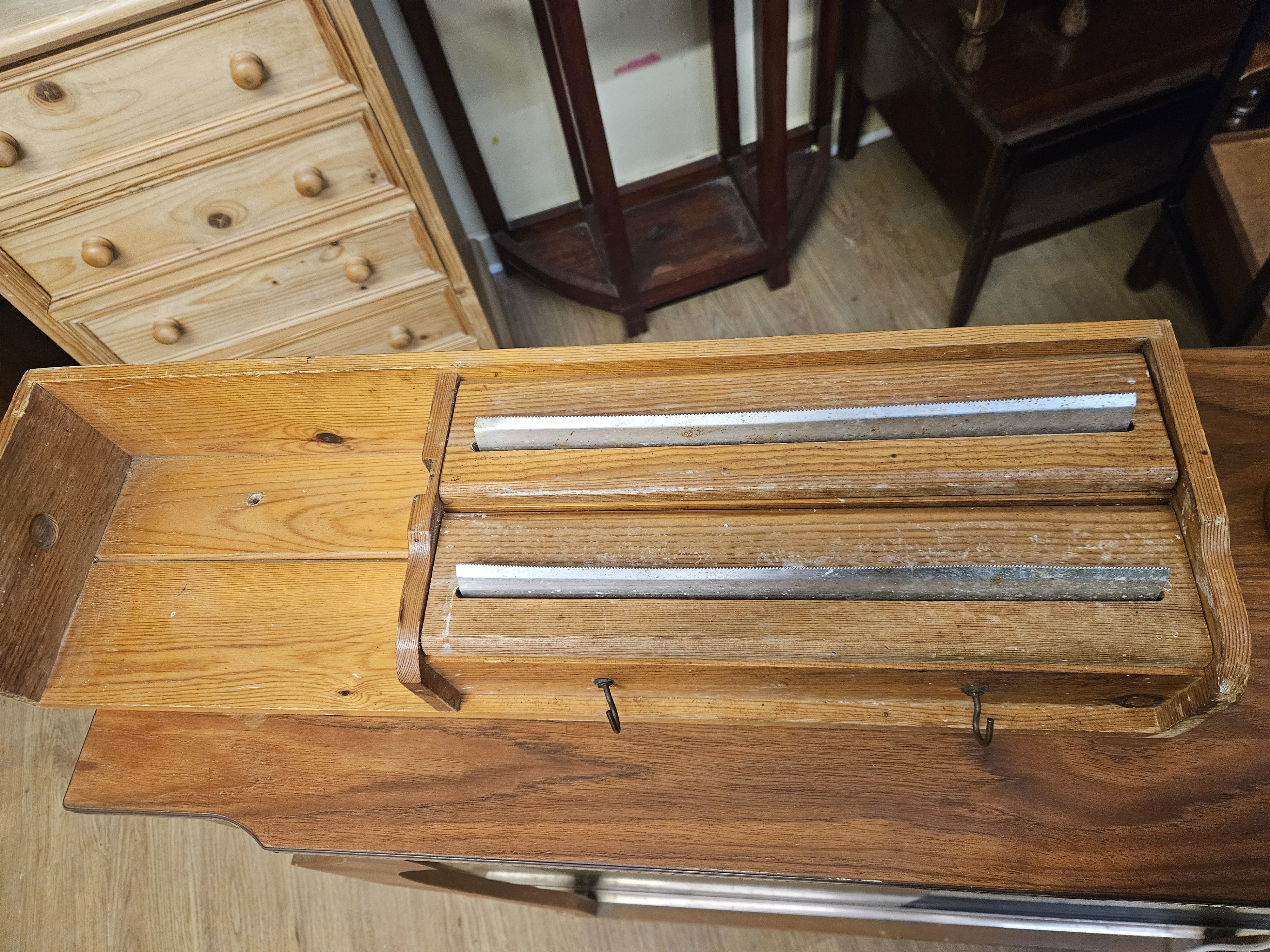 A utilitarian wall-mounted kitchen roll dispenser constructed from pine. The unit features a double-compartment design with two horizontal slots fitted with serrated metal cutting strips, intended for aluminium foil and plastic wrap, alongside an open storage shelf to the left. Two small metal cup hooks are mounted on the underside of the main body. The piece exhibits a simple, functional construction with visible wood grain and knots. No maker’s marks or signatures are visible.