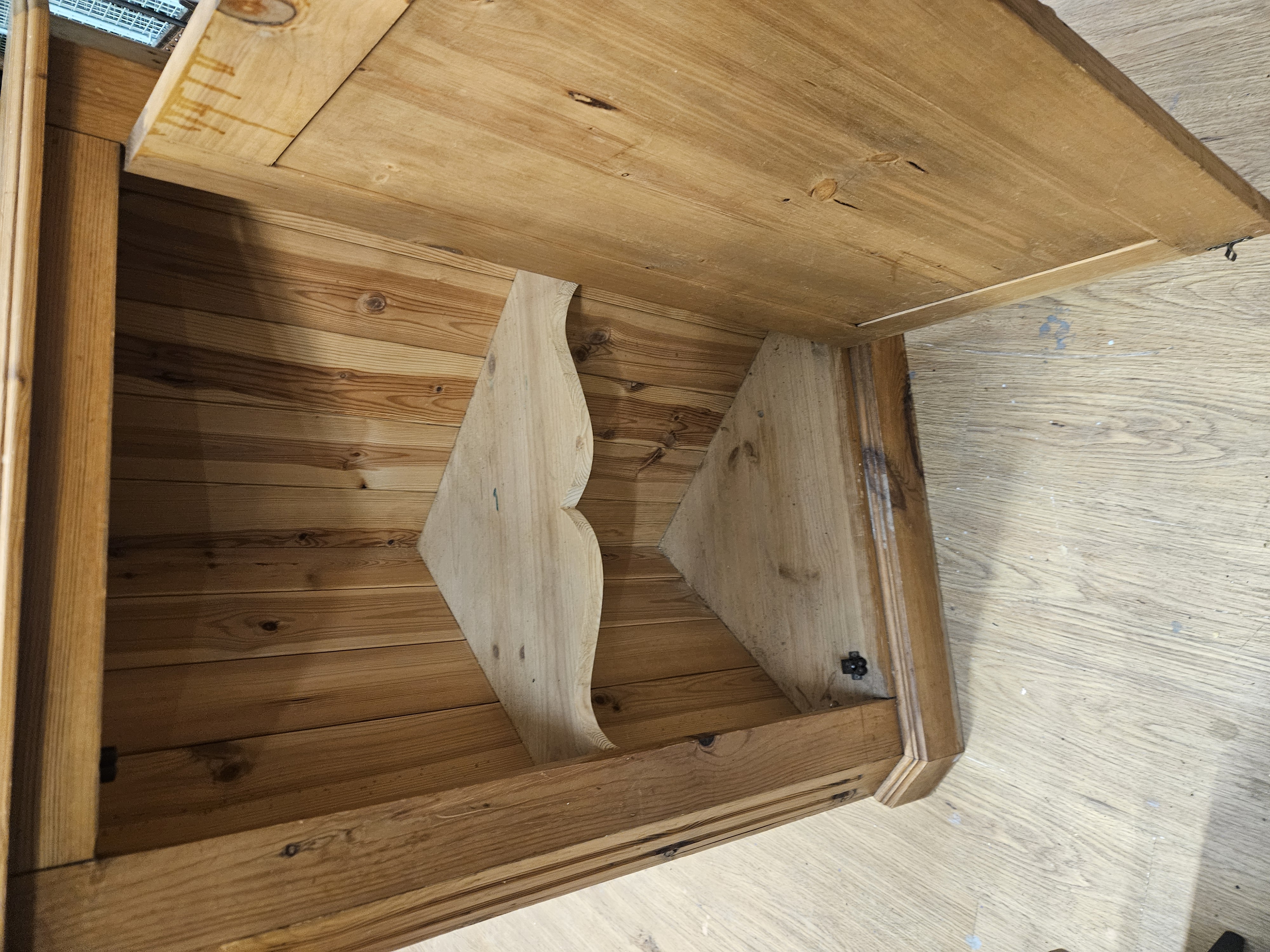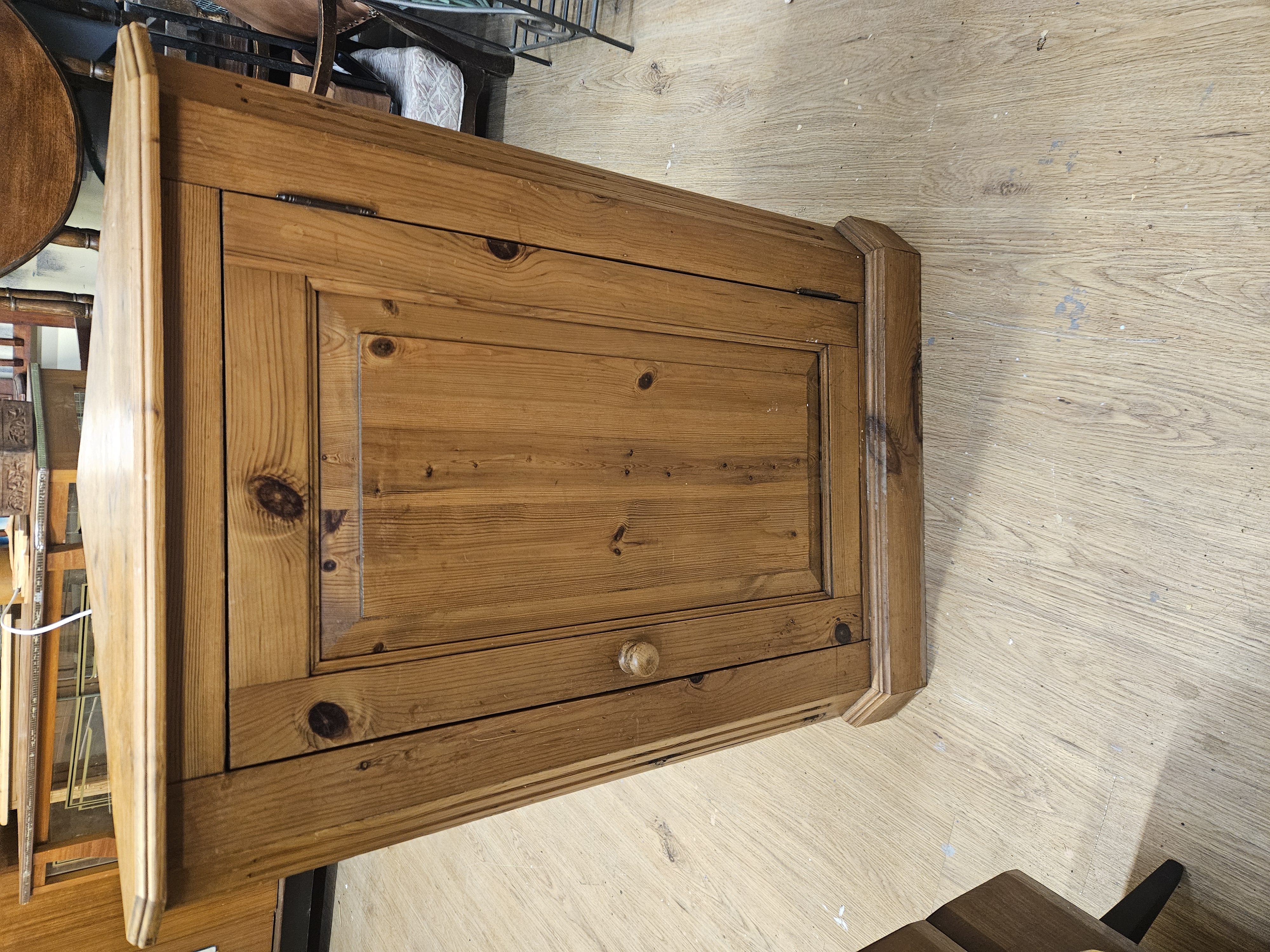 A single-piece wall-hanging corner cupboard constructed from knotty pine in a country farmhouse style. The unit features a single door with a recessed central panel, secured by metal butt hinges and a turned wooden knob. The interior is lined with tongue-and-groove boarding and contains two fixed shelves with decoratively scalloped front edges. The structure is finished with simple moulded cornices to the top and base. A modern magnetic catch is fitted to the interior frame. No maker’s marks, labels, or stamps are present on the piece.