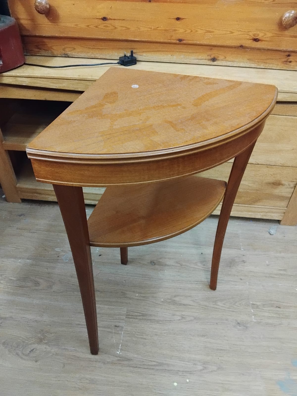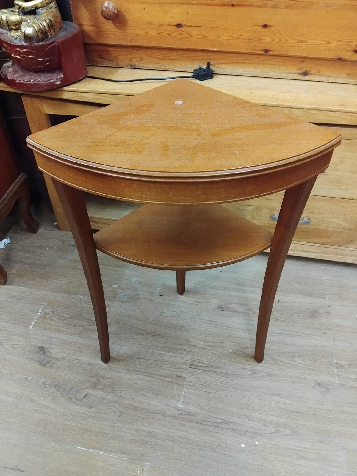 A 20th-century corner side table or occasional table designed in the Regency style. The item features a quarter-round top with a moulded edge and a veneered surface, likely yew or cherry wood. The base consists of three tapering square-section legs with a slight splay, supporting a conforming lower undershelf. No maker’s marks, labels, or stamps are visible.
