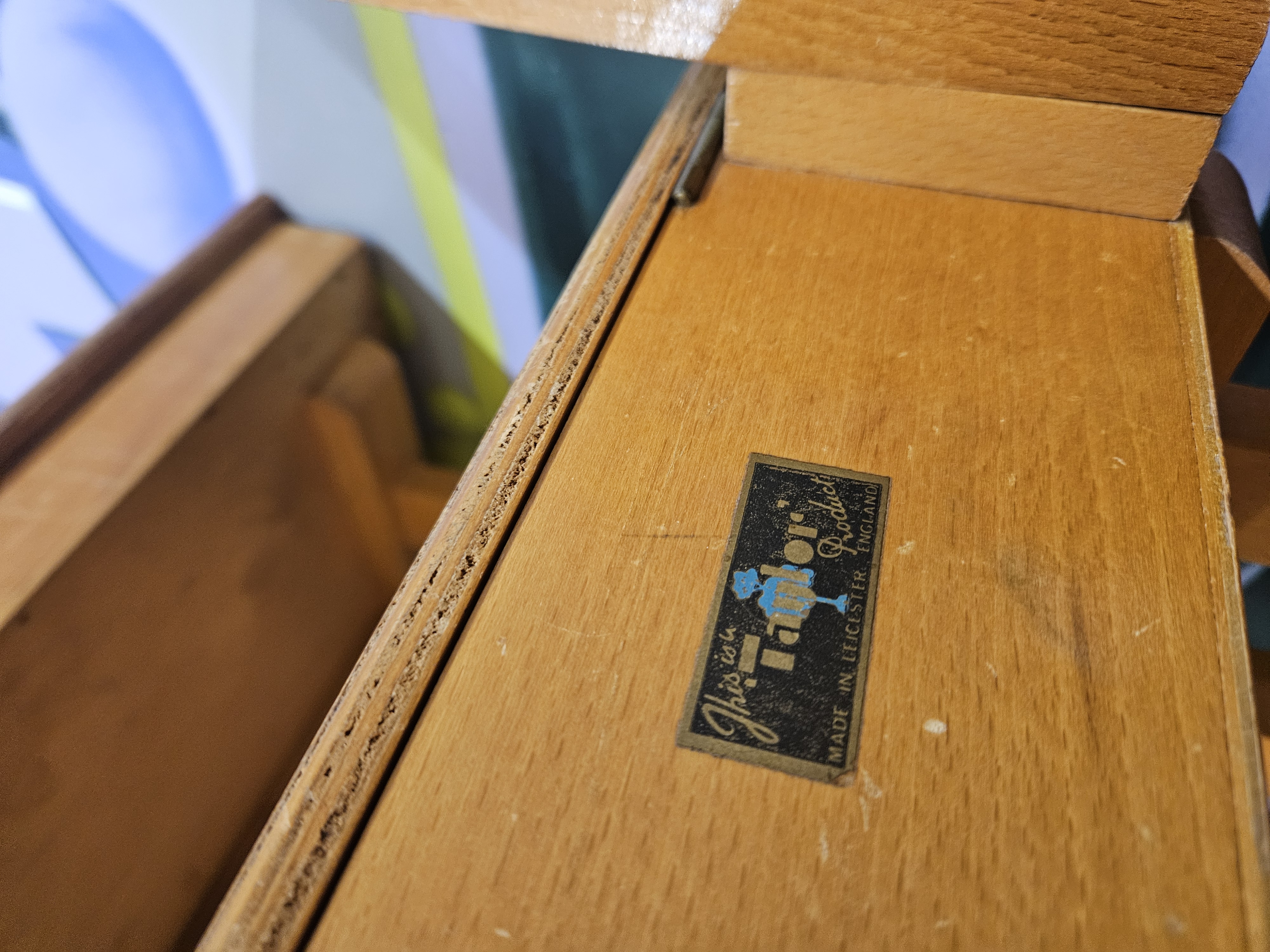 A mid-20th century child’s school desk and matching chair set manufactured by Taylor Product in Leicester, England. The set is constructed from light-coloured hardwood, likely beech, with plywood used for the desk lid and chair backrest. Both the desk storage box and chair seat box feature visible finger-joint construction. The desk is designed with a sloping top featuring a recessed pen groove and a wooden ledge at the base. The lift-up lid opens to reveal a single storage compartment, supported by a metal stay chain. The matching chair features a T-frame base and a shaped plywood backrest. The interior of the desk bears a black and gold foil label reading this is a Taylor Product with a blue humanoid figure icon and MADE IN LEICESTER ENGLAND.