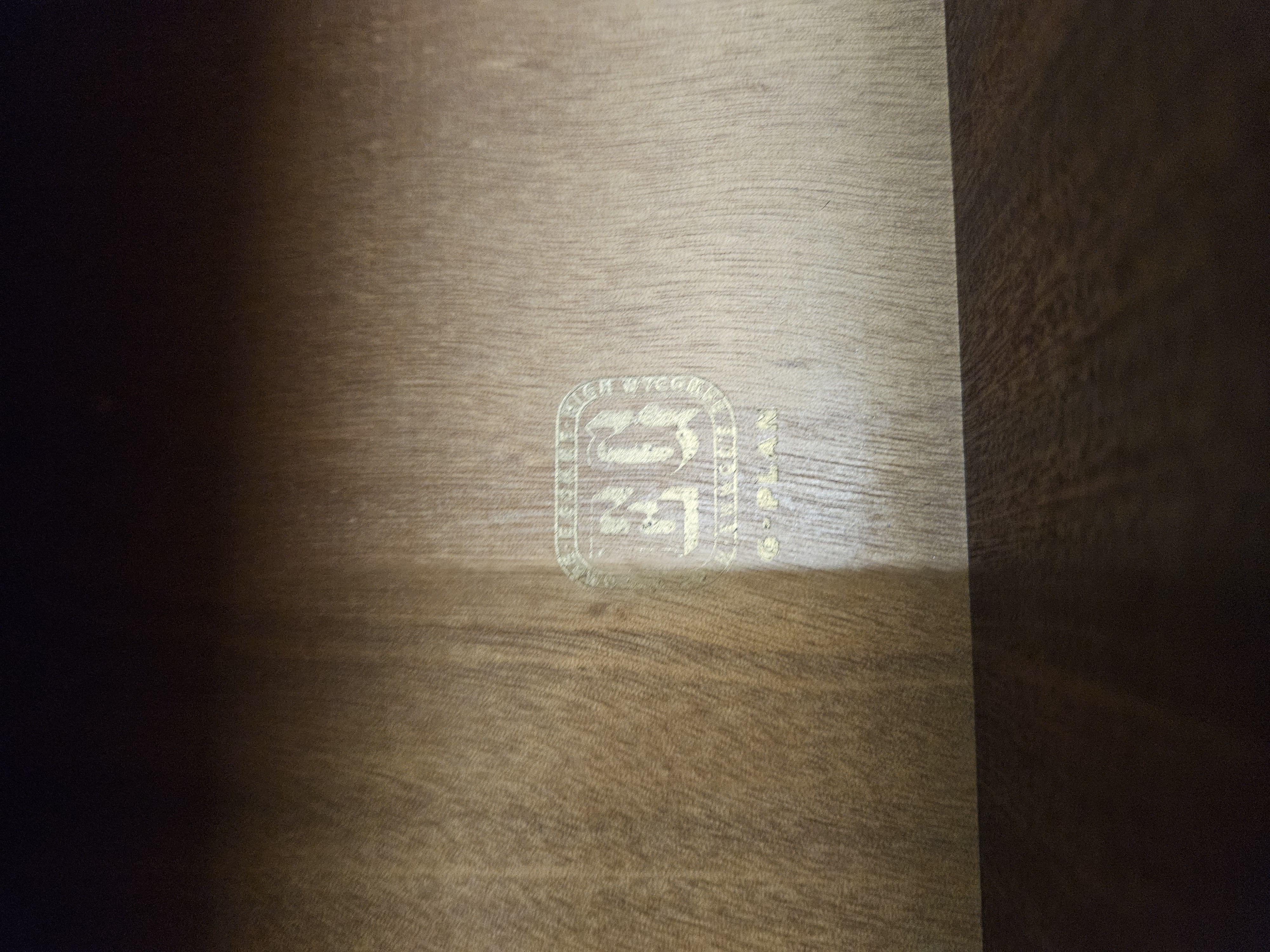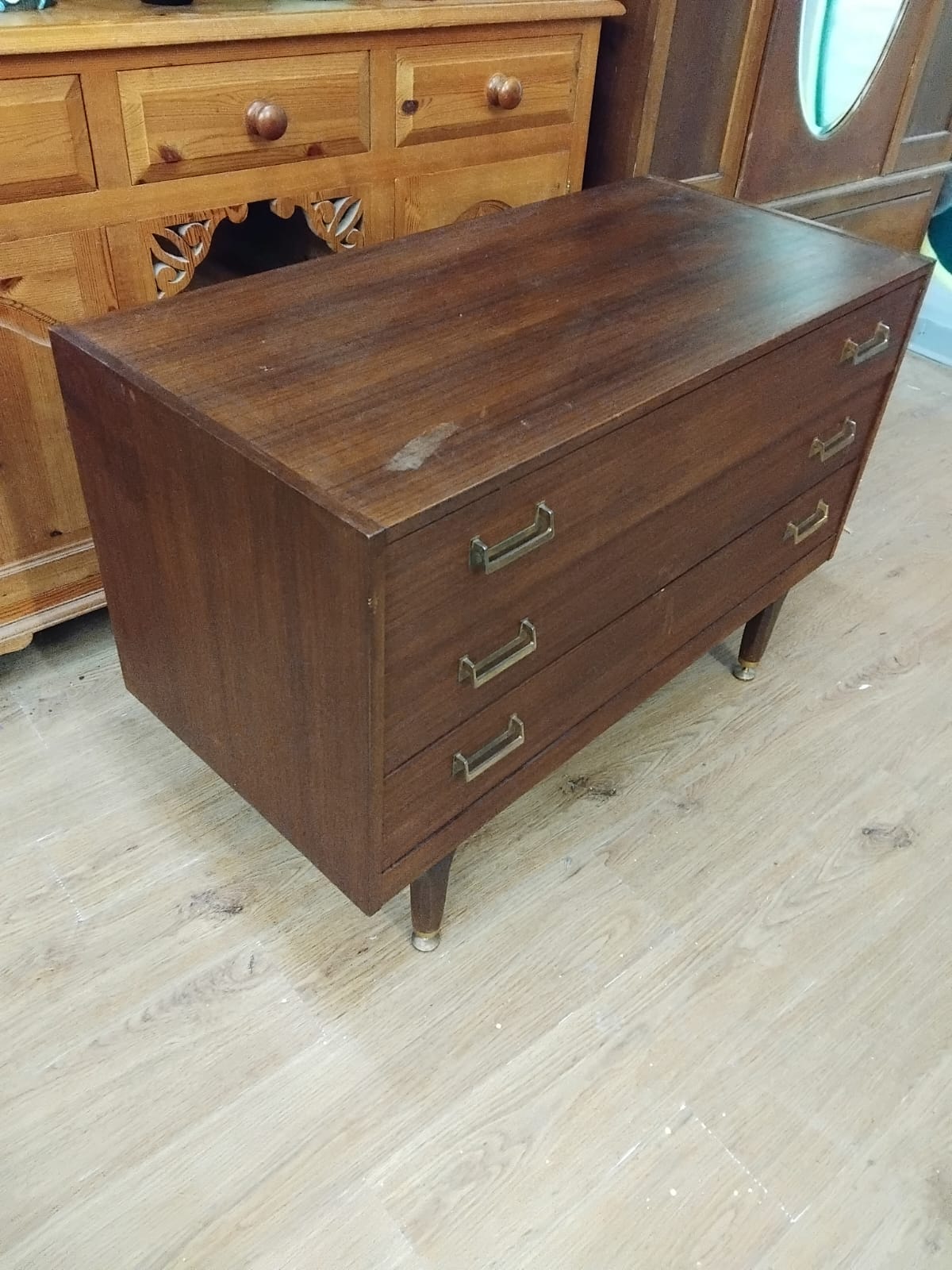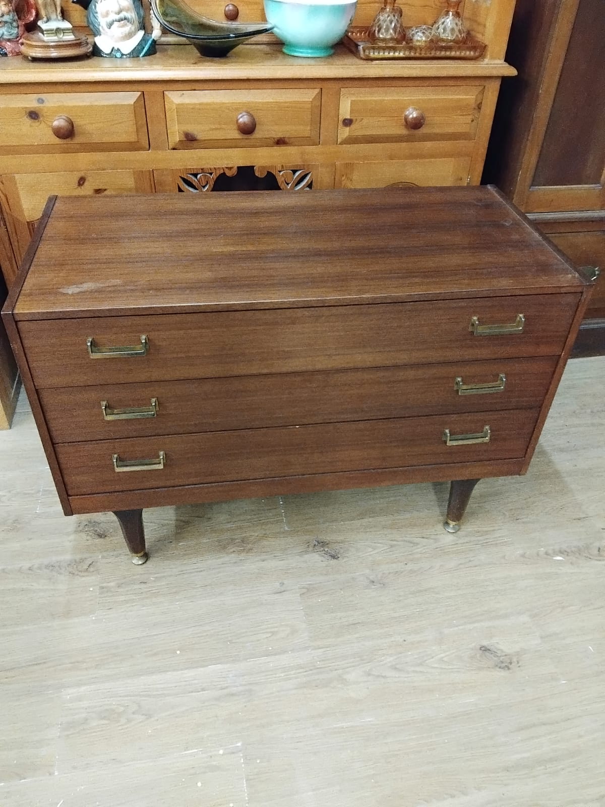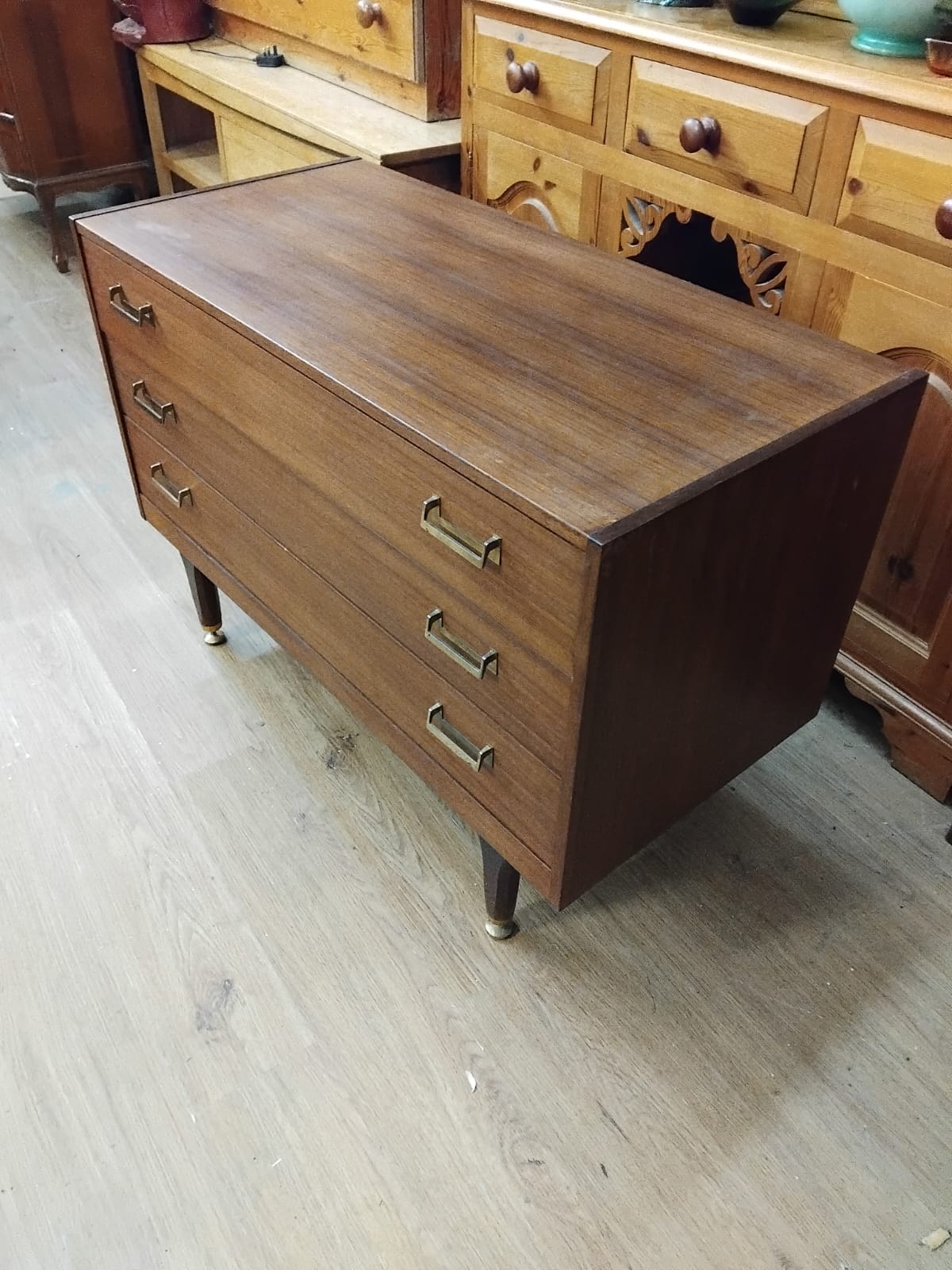 This mid-century modern chest of drawers is from the Librenza or Tola and Black range produced by the British manufacturer E. Gomme Ltd. under the G-Plan brand. Dating from the late 1950s to early 1960s, the unit is finished in a dark Tola (African Mahogany) veneer. The chest features three full-width graduated drawers, each fitted with original rectangular brass-toned pull handles. The secondary wood used for the drawer linings is a lighter hardwood. The piece is supported by four tapered legs, each finished with adjustable brass ferrules. An interior drawer contains the authentic gold-embossed stamp featuring the stylised EG logo, the words High Wycombe, and the G-Plan brand name. This specific mark was utilised by the company between 1952 and 1965.