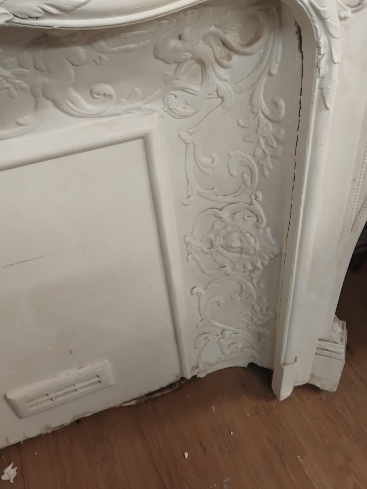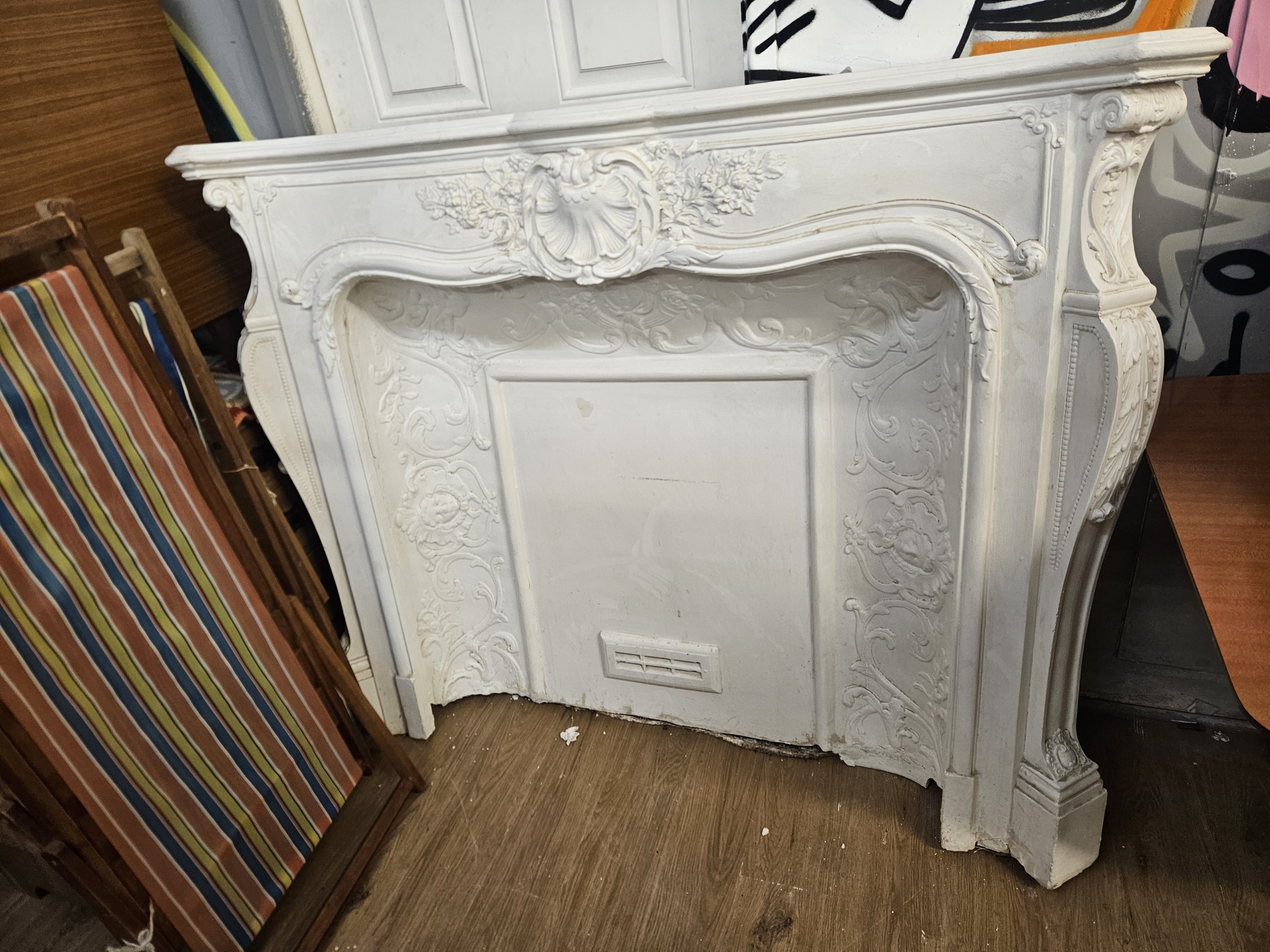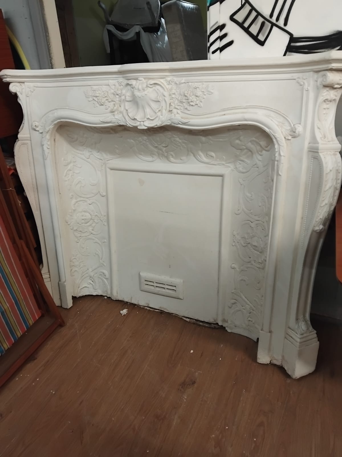 A decorative fireplace mantel and surround executed in the Rococo Revival style. The piece is constructed from cast plaster or composite material with a white-painted finish. The serpentine lintel is centred with a prominent shell-form rocaille crest, which is flanked by high-relief floral swags and scrolling acanthus foliage. The curved jambs feature matching scrolled and floral decoration, leading down to block bases. The set includes a fitted decorative interior panel with low-relief scrolling foliate borders and a central rectangular section. A modern-style ventilation grille is set into the lower portion of the central panel, suggesting use as a decorative cover for a decommissioned fireplace or an electrical heating unit.