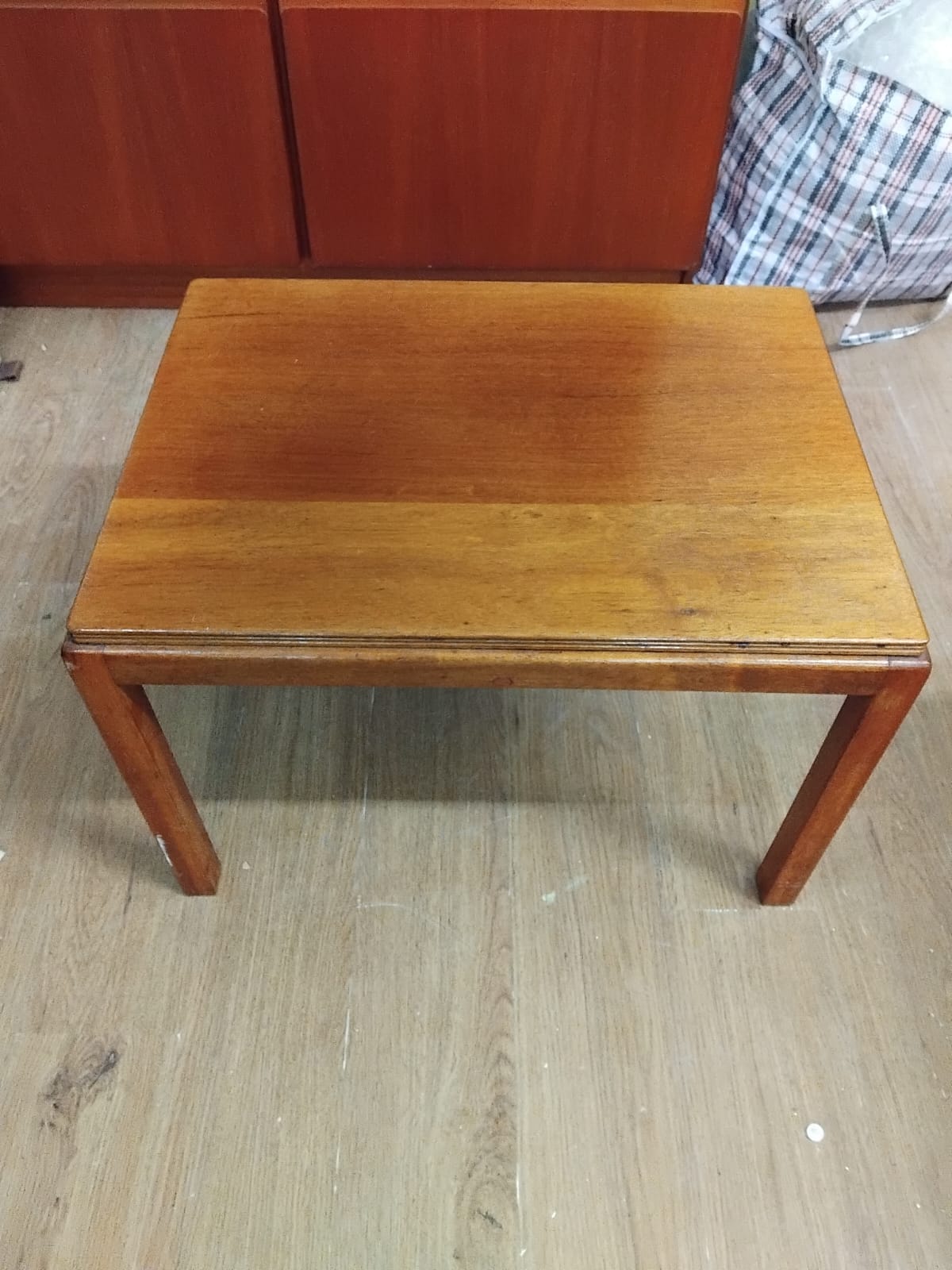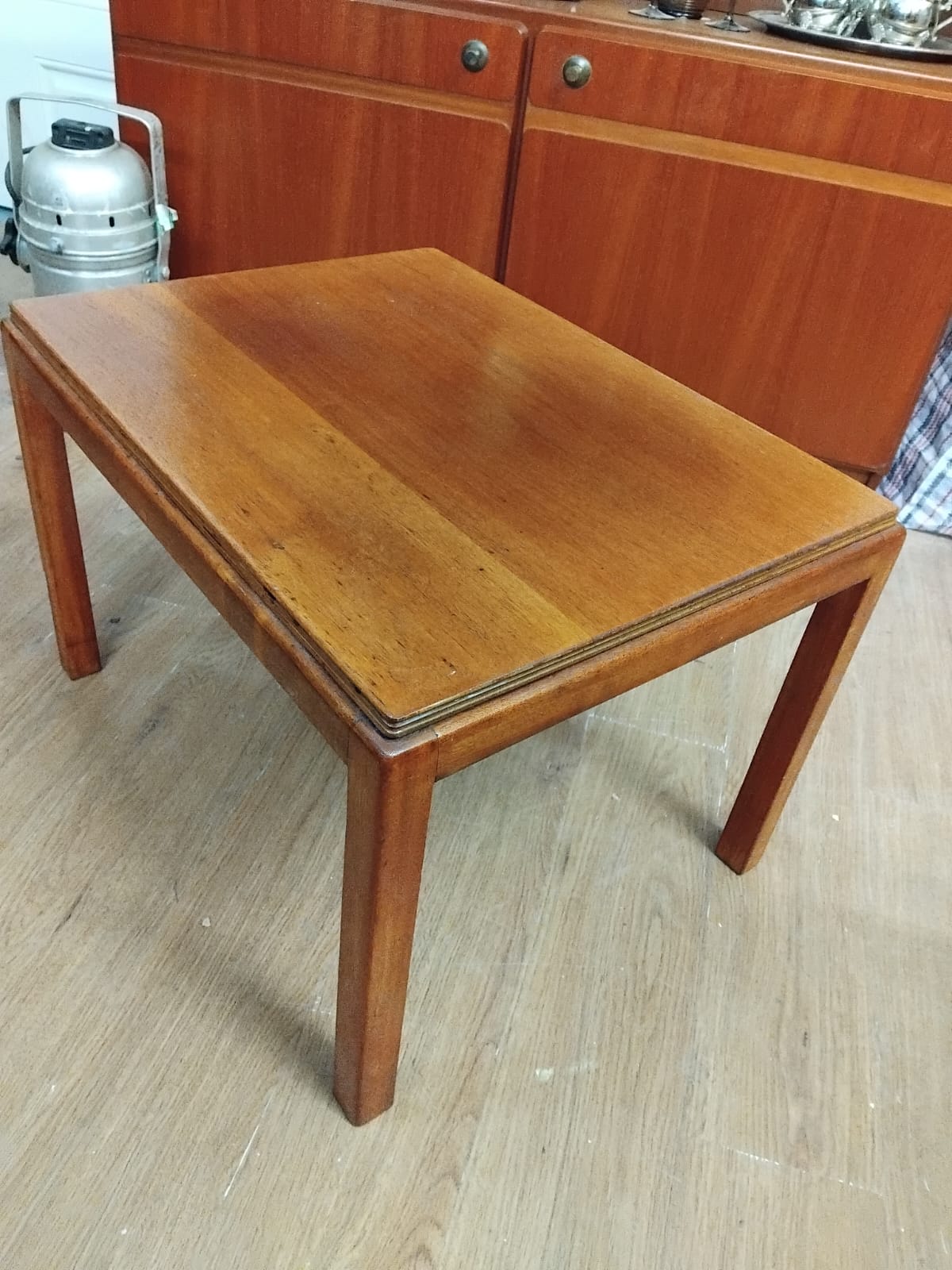 A mid-century modern coffee table of rectangular form, constructed from teak and teak-toned hardwood. The top is finished in teak veneer and features a recessed shadow gap detail along the apron. The piece is supported by four square-section tapered legs which meet the frame with mitred joinery. The design is characteristic of Scandinavian modern furniture from the 1960s and 1970s, sharing stylistic similarities with works by manufacturers such as Heggen of Norway. No maker’s marks or labels are visible on the piece.