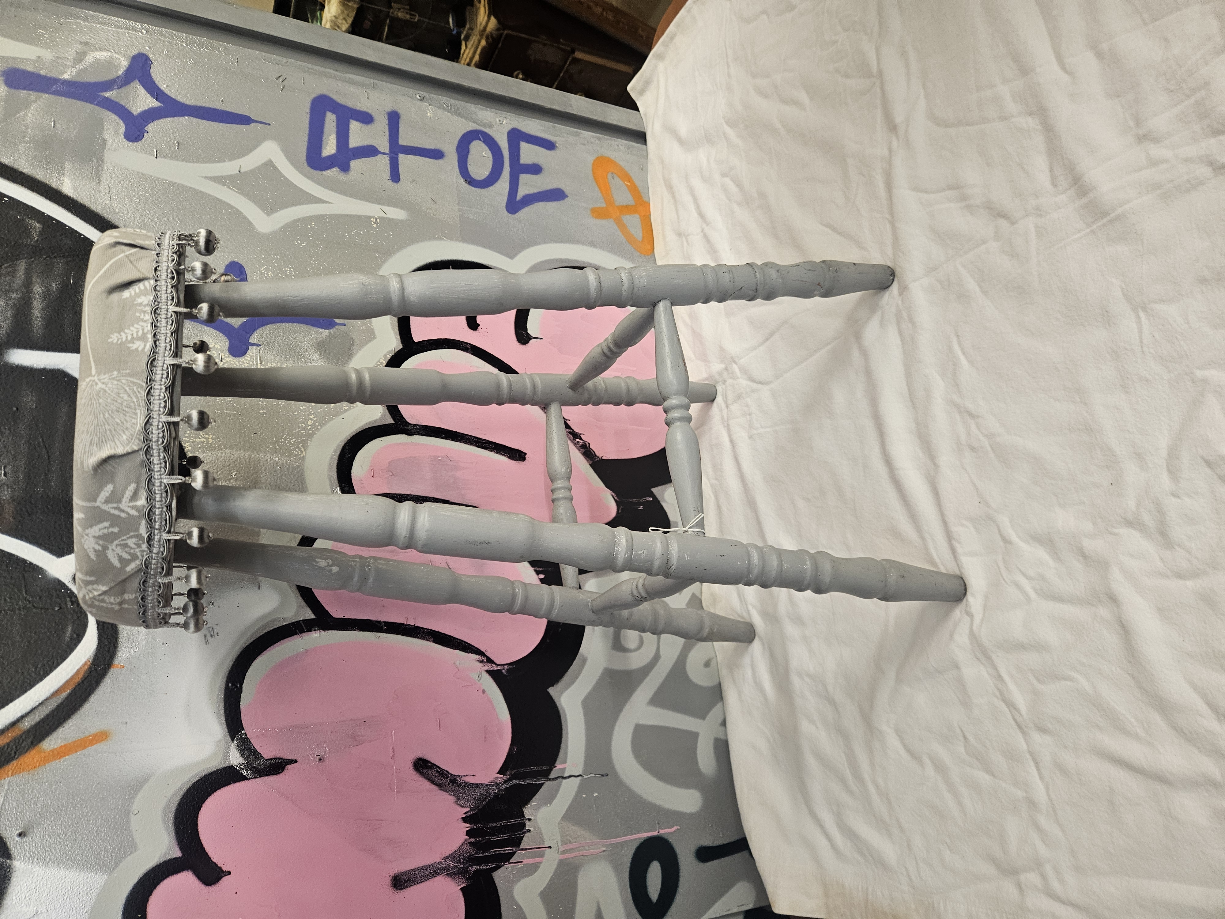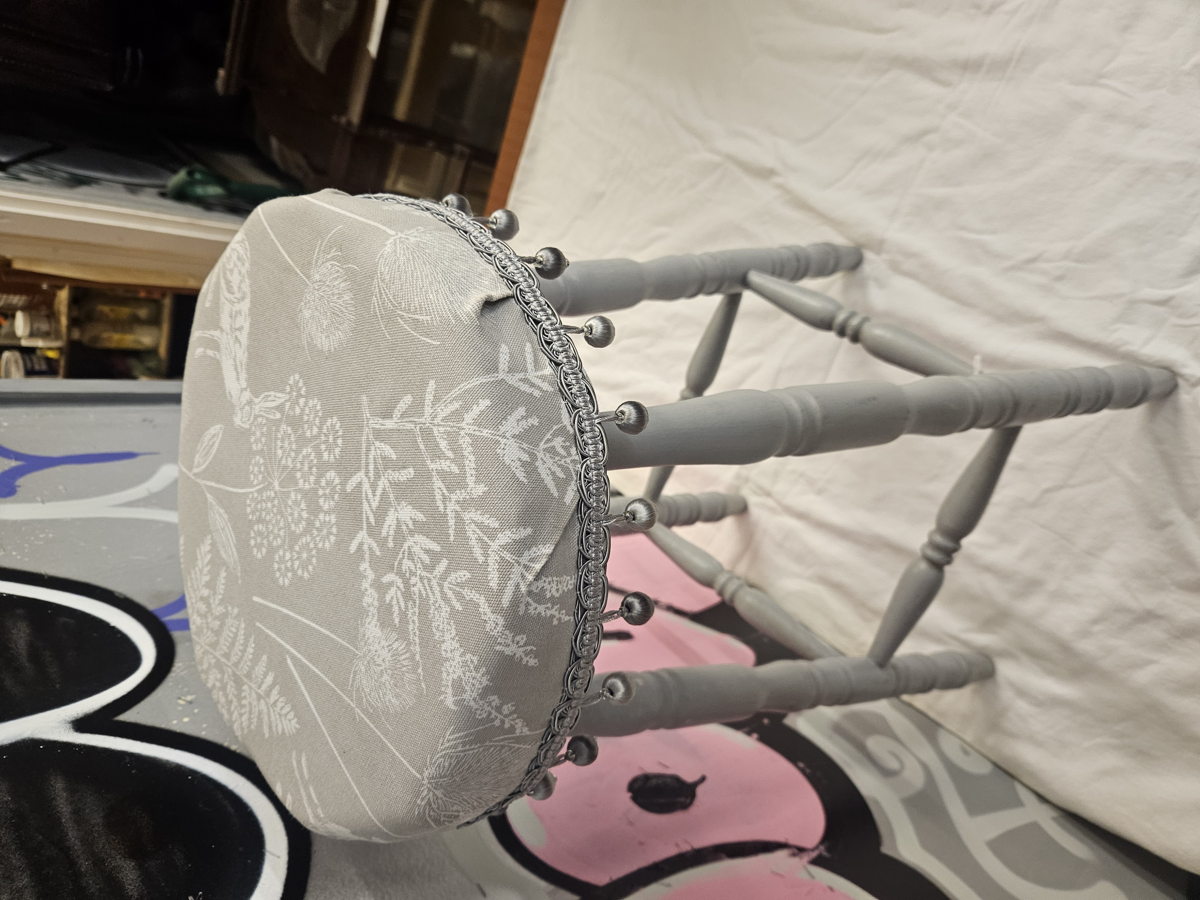 A single high bar stool featuring a turned wood frame finished in a matt grey paint. The structure consists of four bobbin-turned legs secured by two levels of matching turned stretchers. The circular padded seat is covered in a grey and white textile with a botanical pattern depicting ferns and flowers. The perimeter of the seat is embellished with a grey braided gimp trim featuring suspended spherical bobble fringe. No manufacturer marks or stamps are visible on the piece. A small white string tag is attached to one stretcher for inventory purposes.