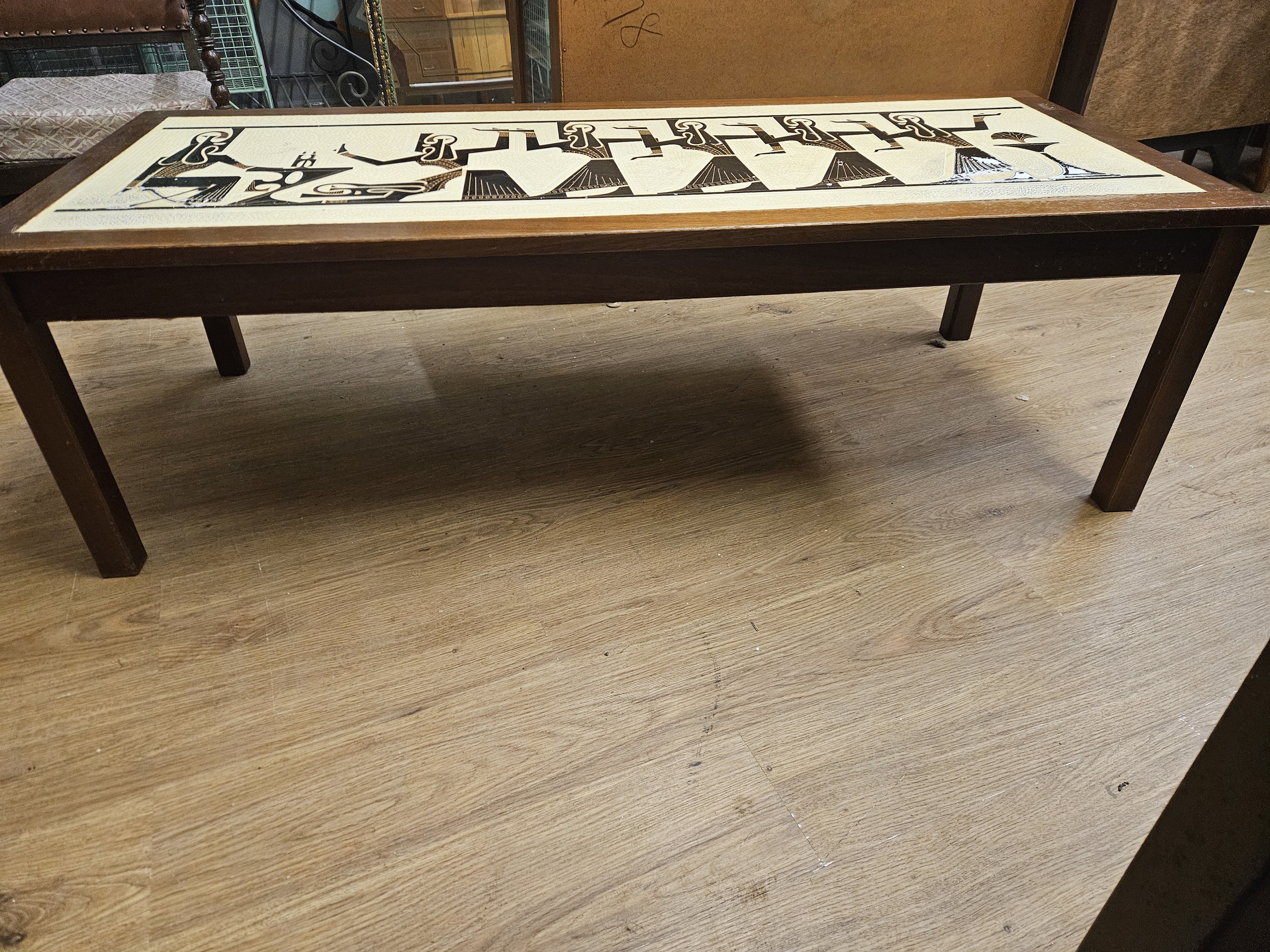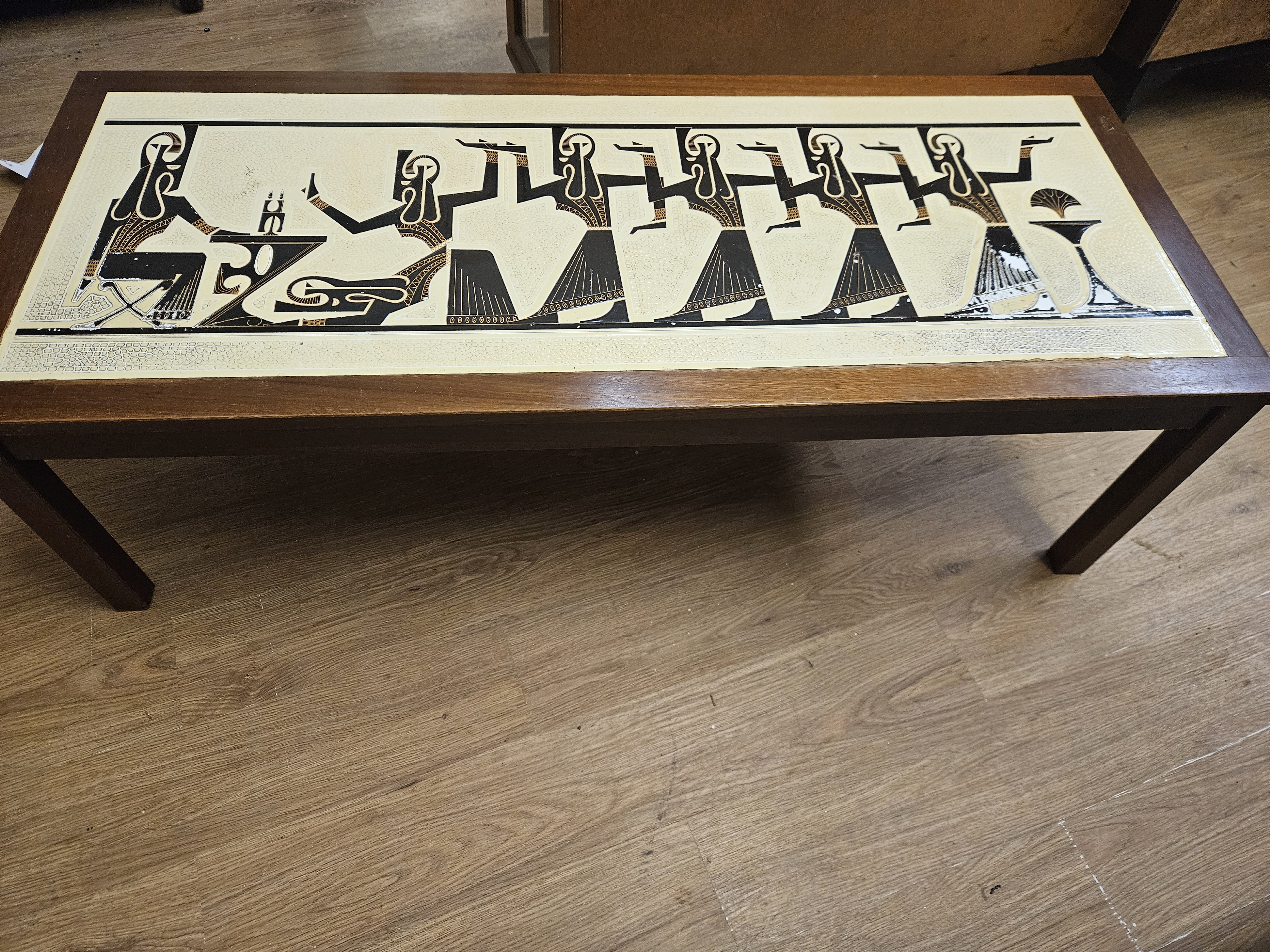 A mid-century modern coffee table, circa 1960s-1970s, constructed with a teak-veneered rectangular frame and four solid teak square-tapering legs. The tabletop features a large inset decorative panel depicting a stylized procession of figures and traditional motifs in the manner of Senufo Korhogo mud cloth from Cote d’Ivoire. The graphic design is rendered in a palette of black, white, and ochre against a cream-coloured ground. The imagery includes anthropomorphic figures in profile and geometric border patterns. No maker’s marks, stamps, or labels are visible on the exterior surfaces of the piece.