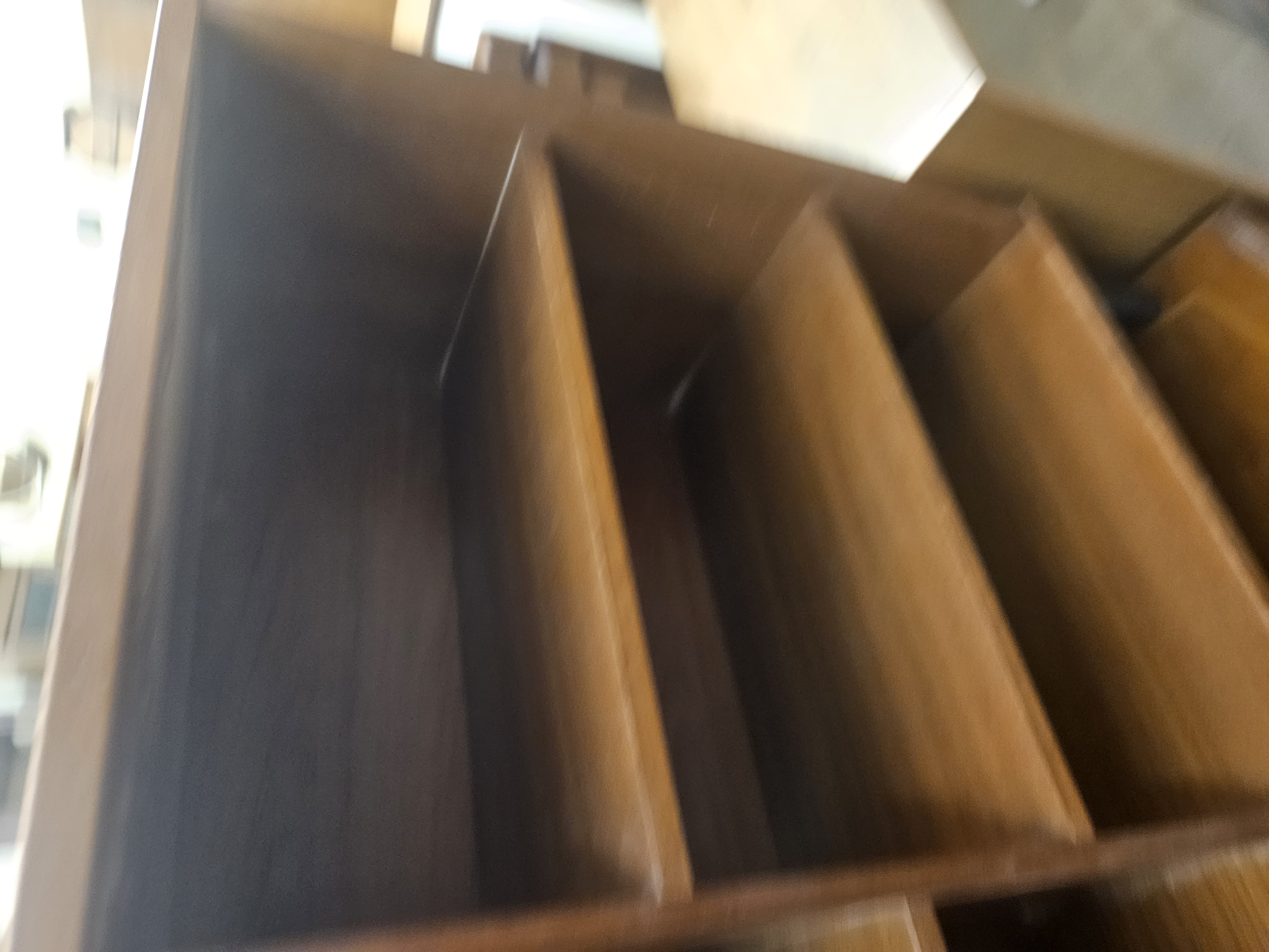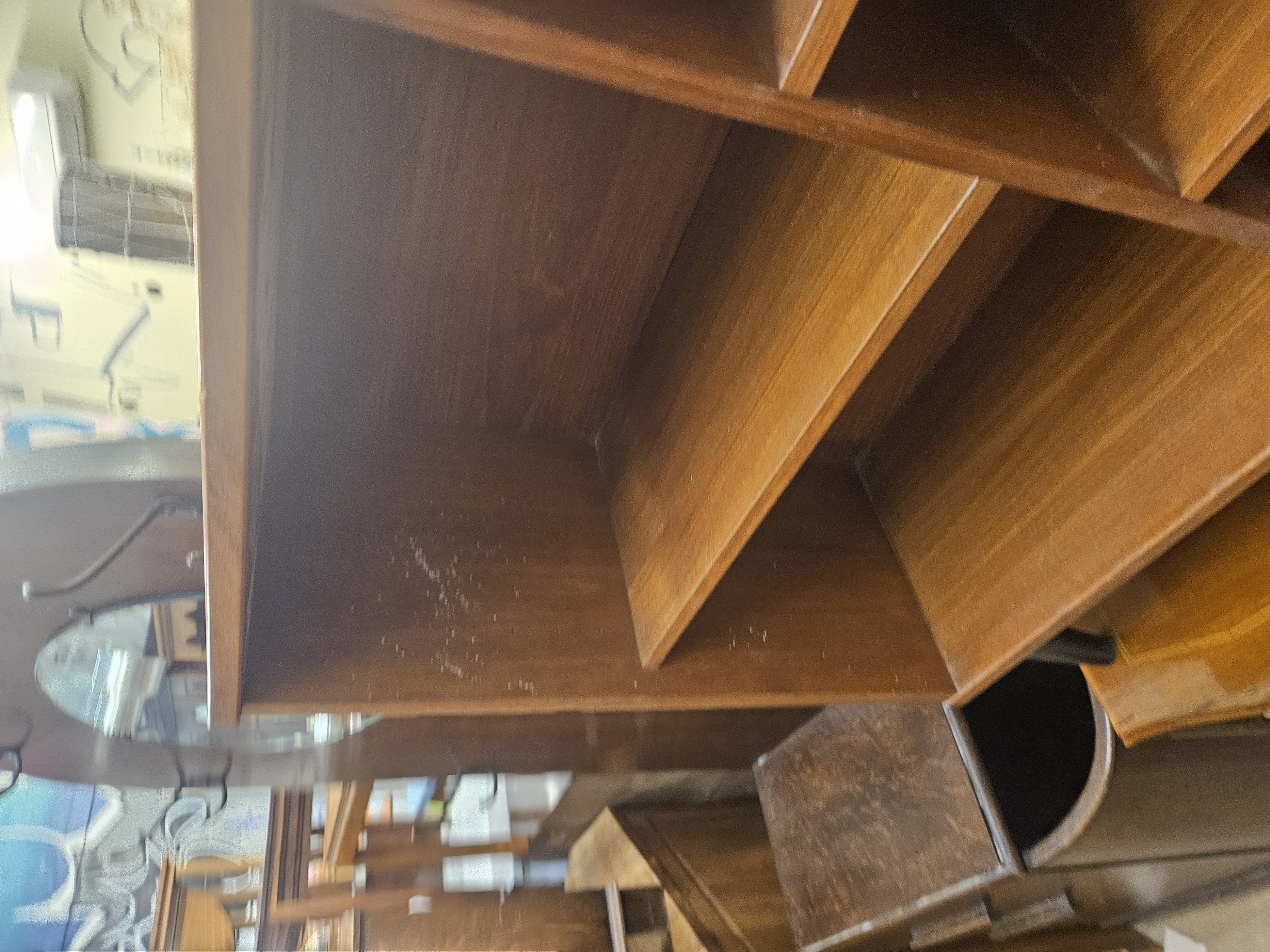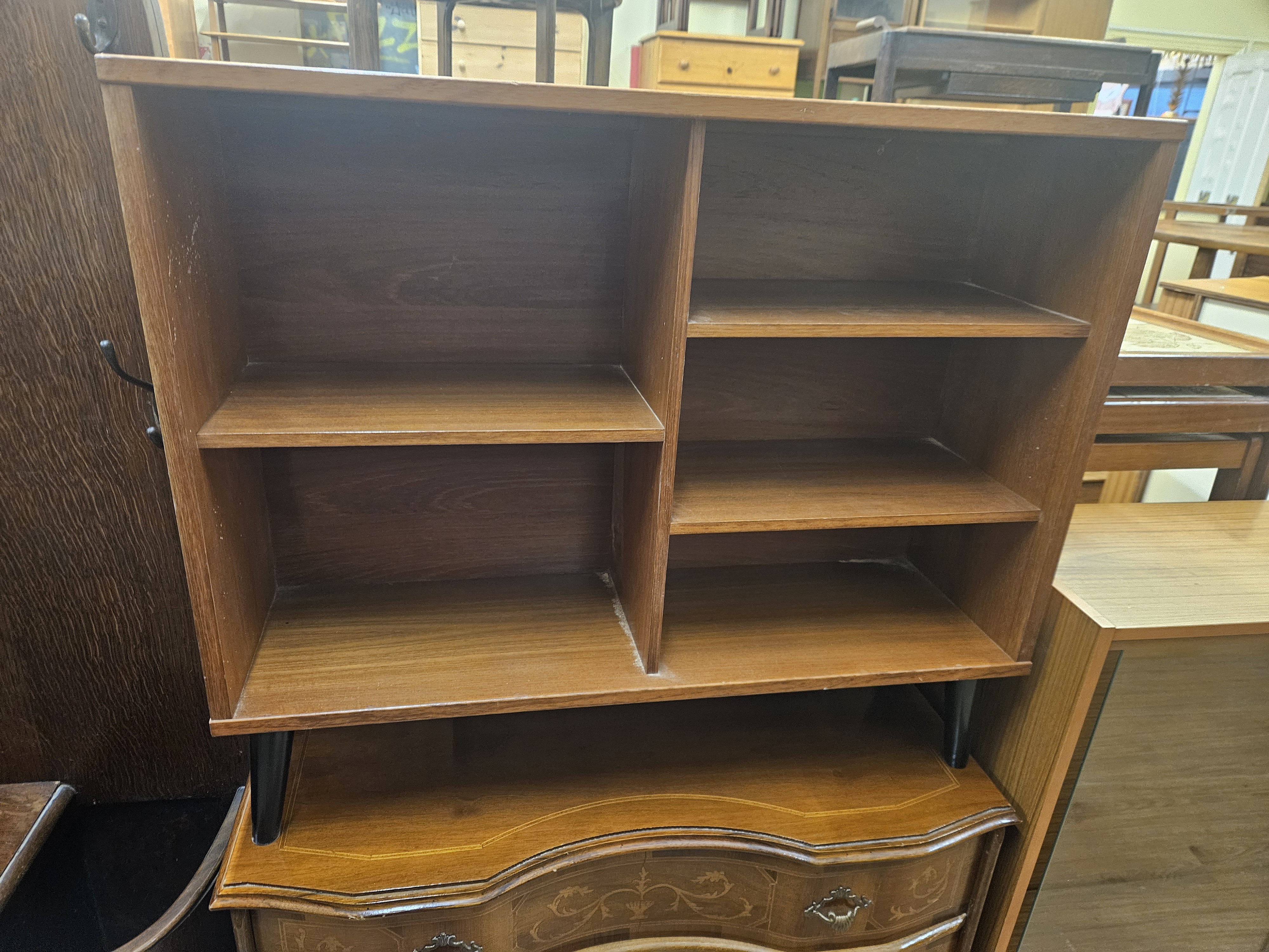 A mid-century modern teak-veneered open bookcase of asymmetric design, dating to the 1960s or 1970s. The unit features a rectangular form divided by a single vertical member, with one fixed shelf to the left and two fixed shelves to the right, resulting in five open storage compartments. The piece is supported by four short, tapered legs with a black finish. This is a single-unit bookcase and is not sectional or stacking. No glazing is present. No maker’s marks or manufacturer labels are visible on the interior or exterior surfaces.