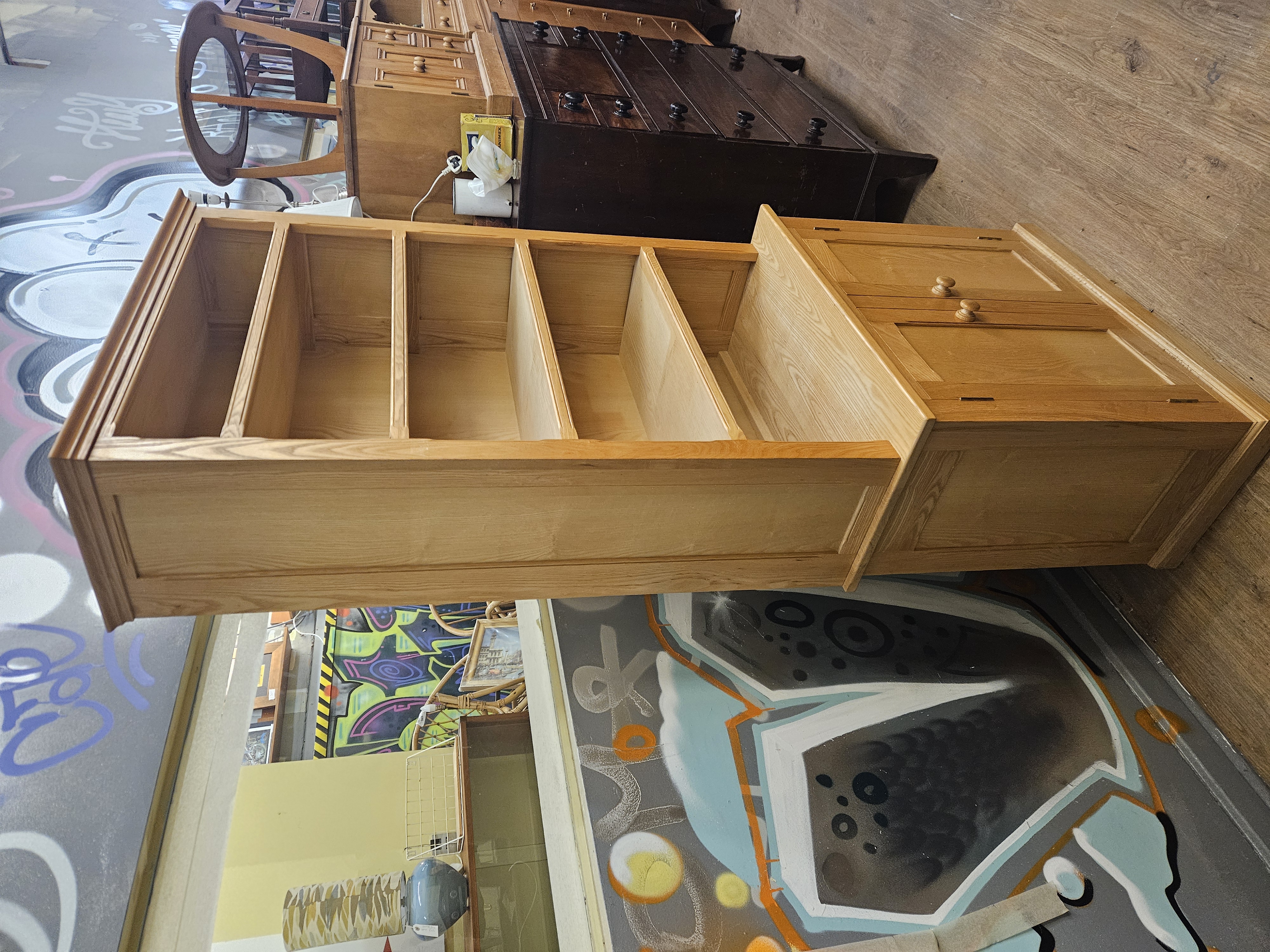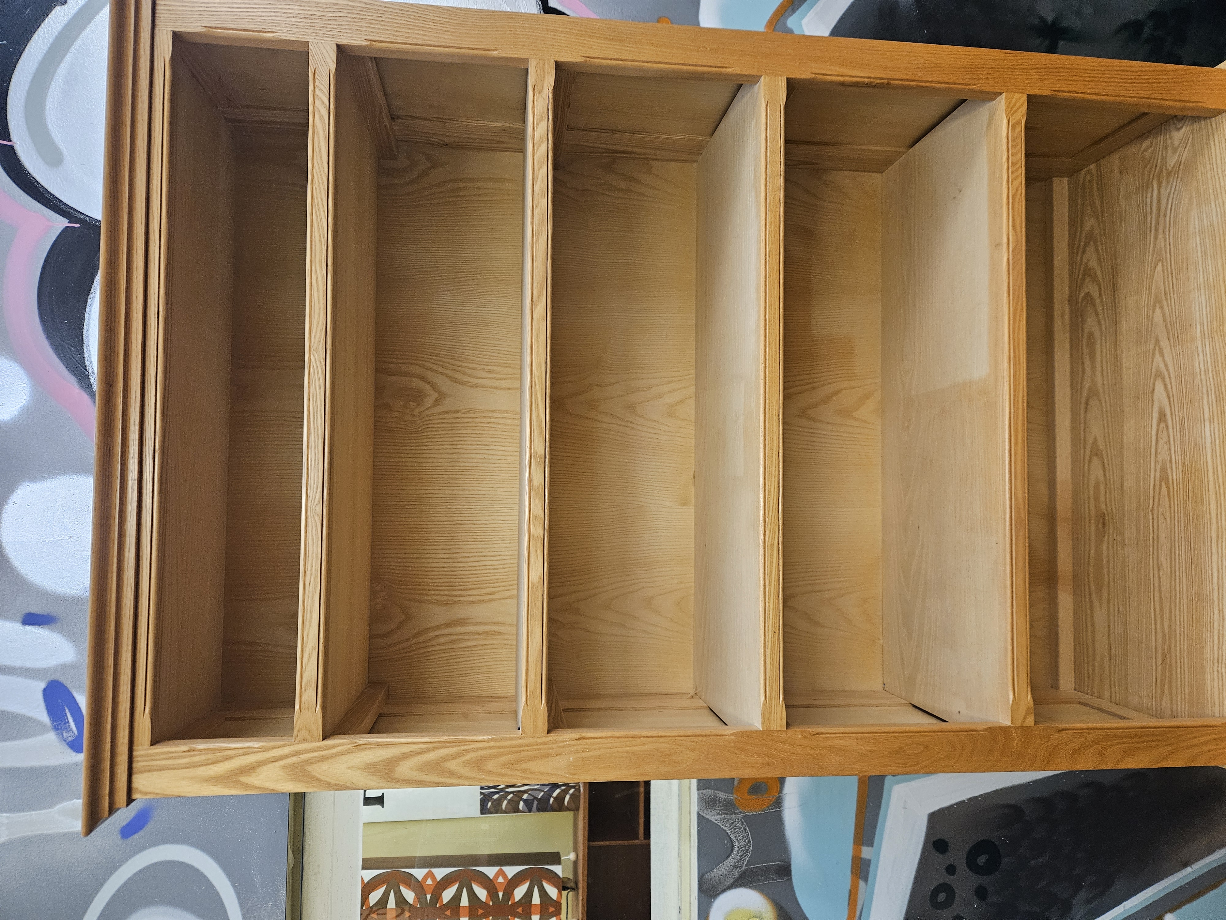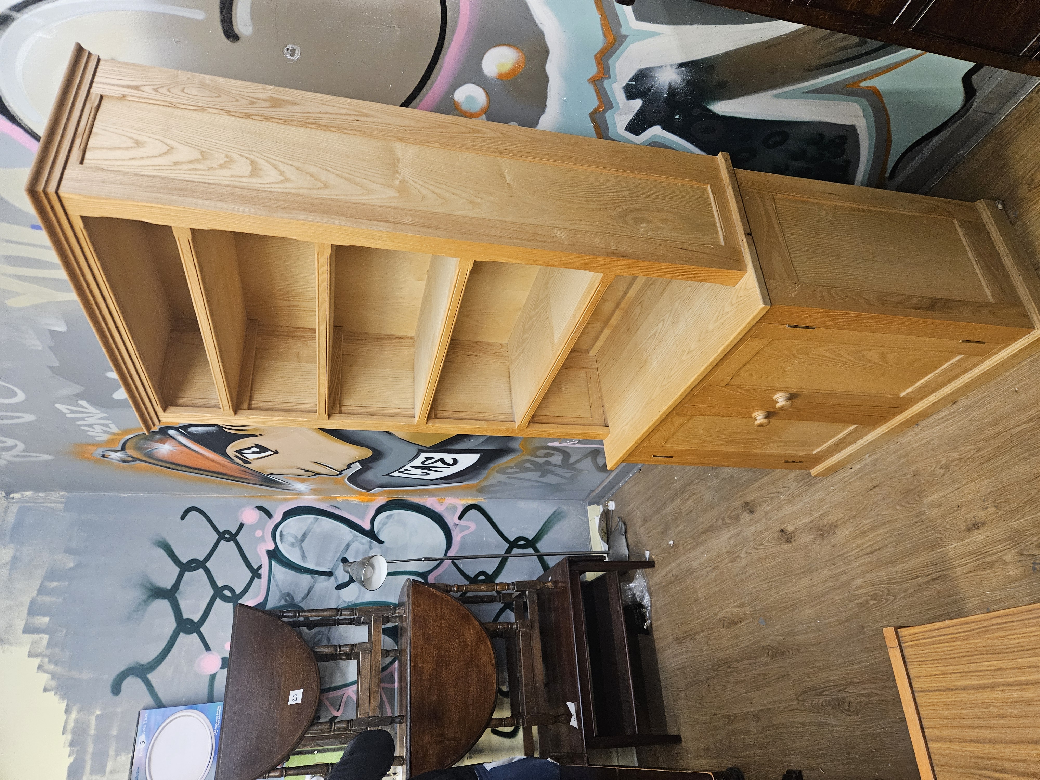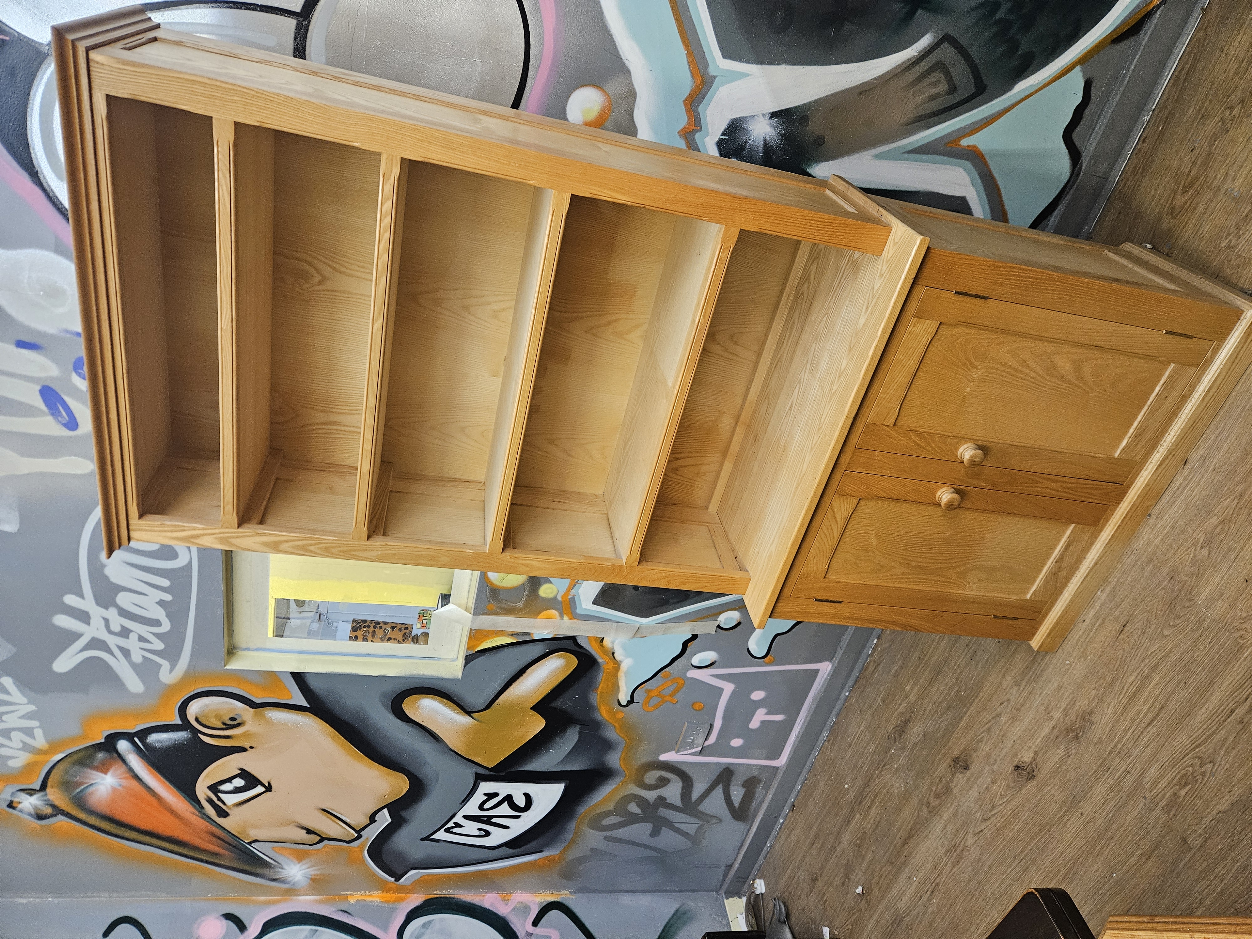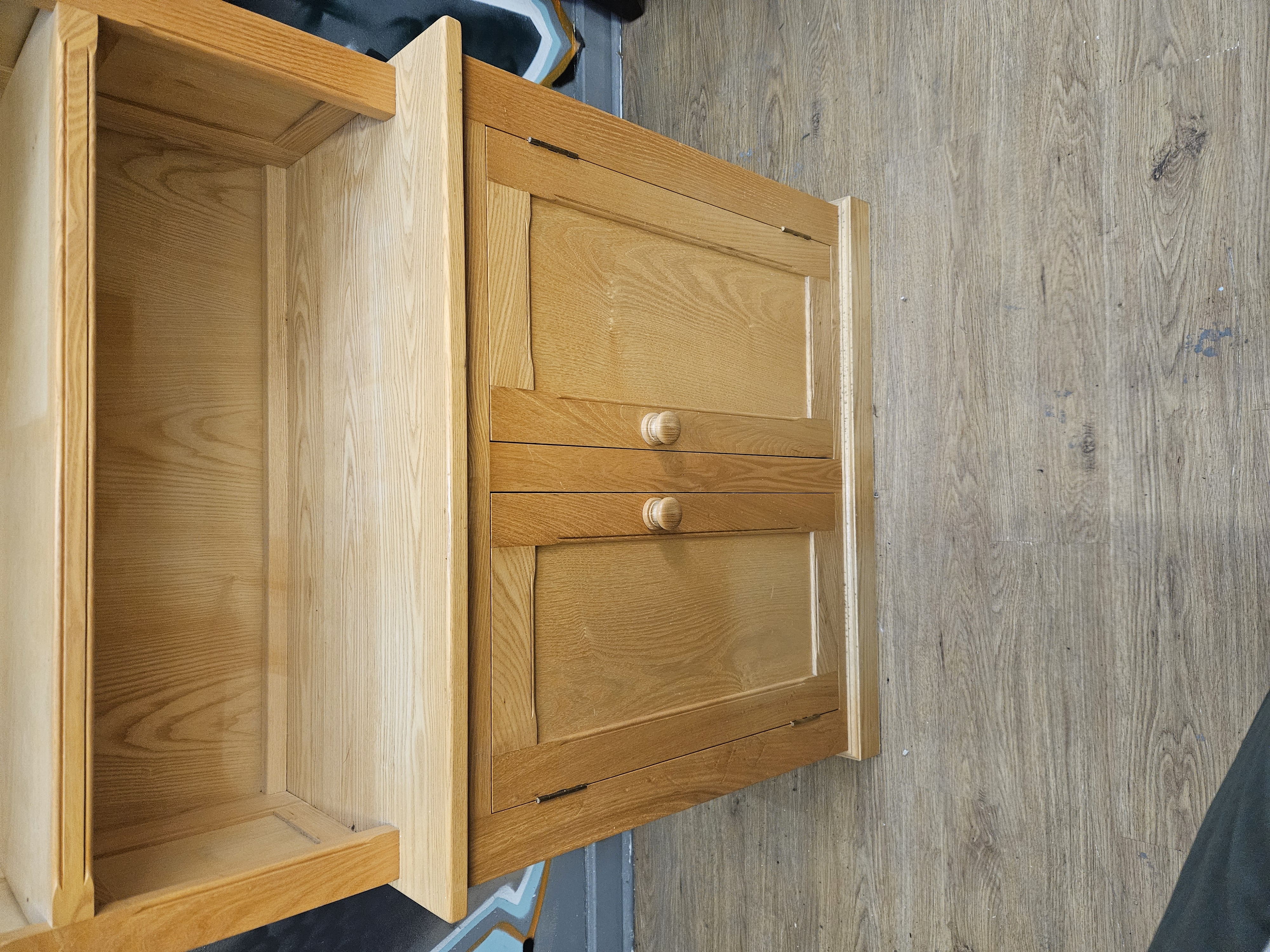 A contemporary bookcase on cupboard base, constructed from a light-toned wood such as ash or oak, featuring a prominent natural grain. The design follows a modern country or Shaker style, similar to the New Country collection by Ethan Allen. The upper section is comprised of a moulded cornice over four fixed shelves, providing five open storage compartments, with panelled sides. The base section is of wider proportions and features a double-door cupboard with panelled doors. The doors are fitted with turned wooden knobs and small metal hinges. The construction consists of two separate units, with the top section sitting upon the base.