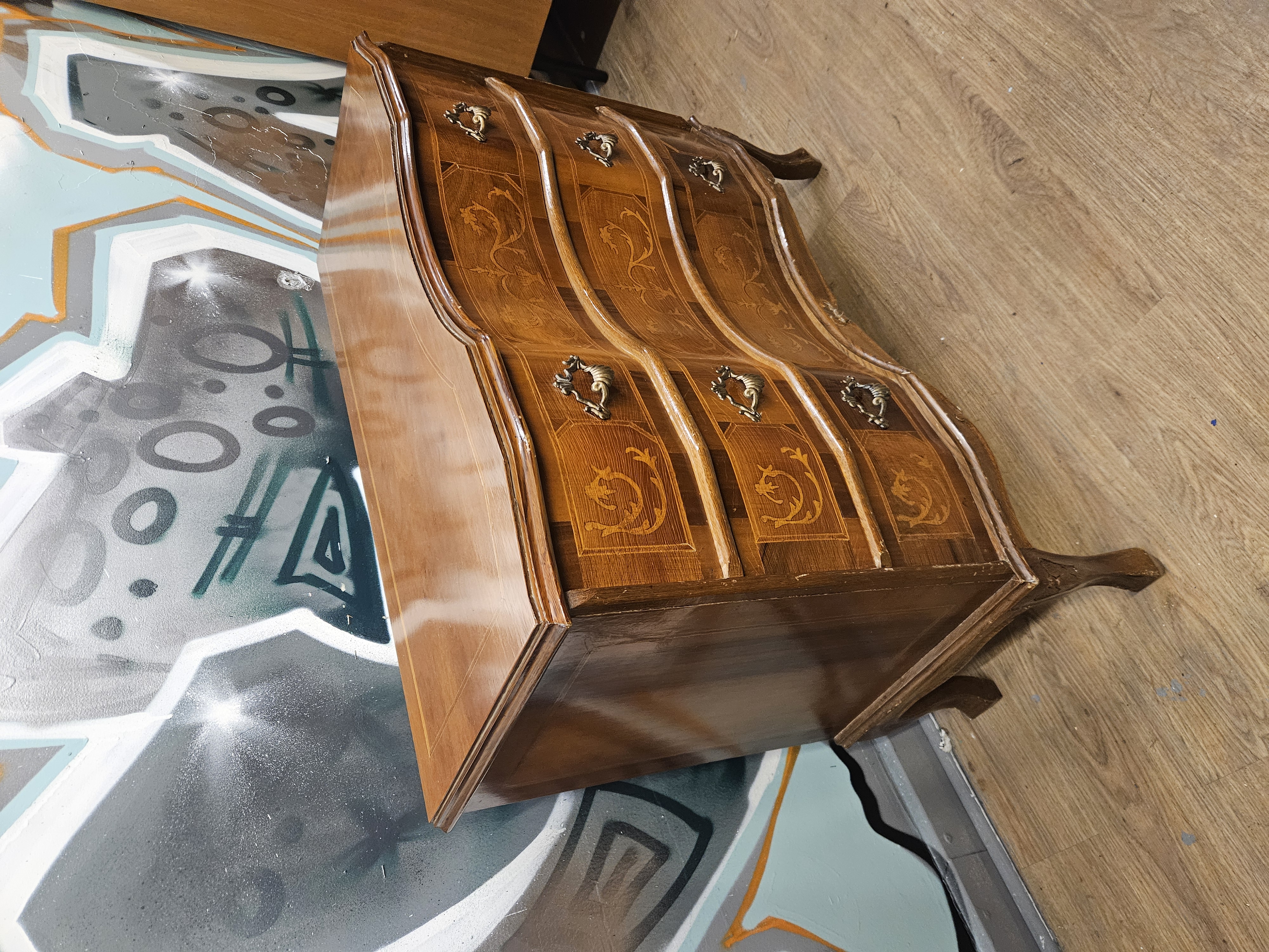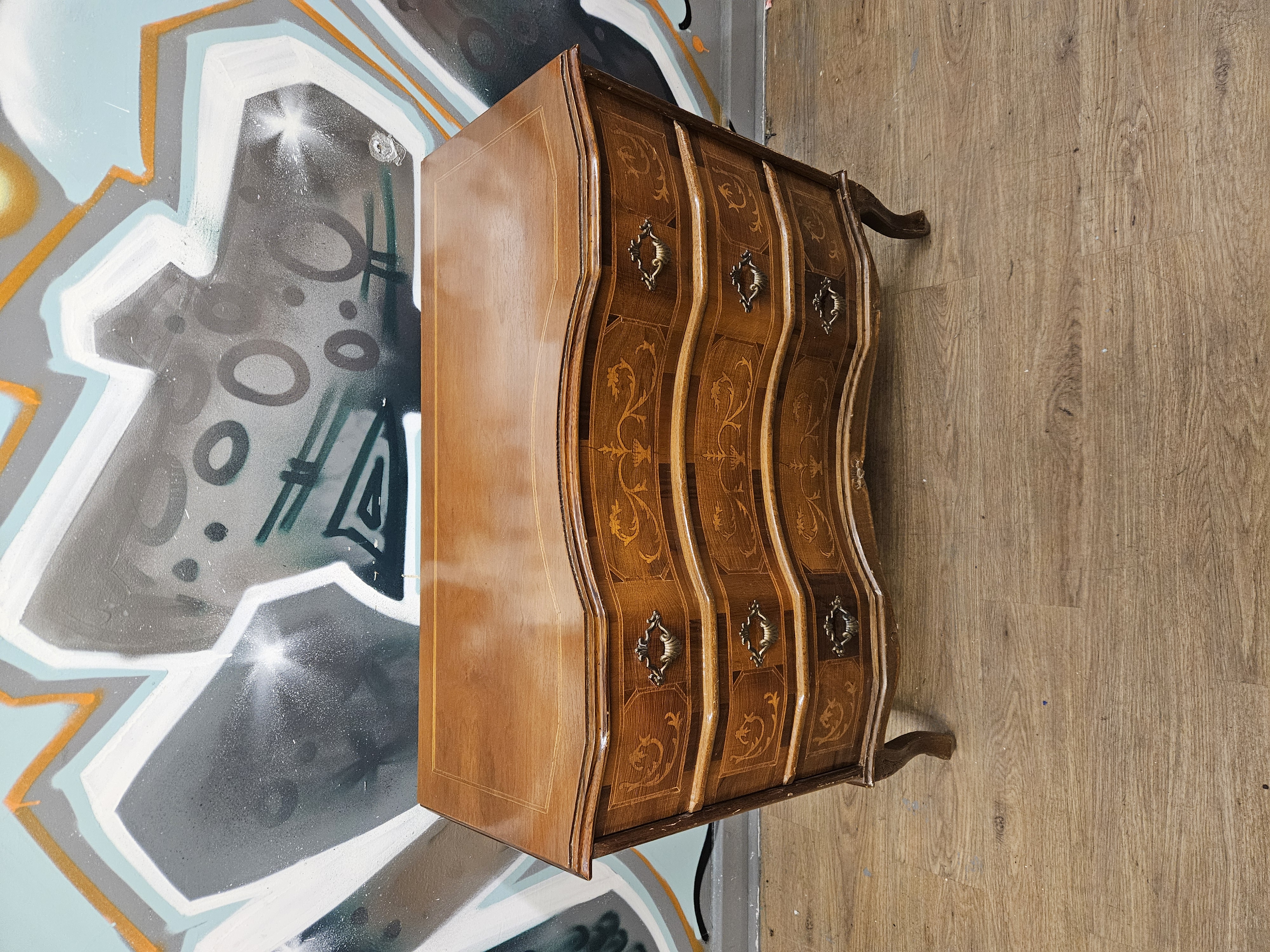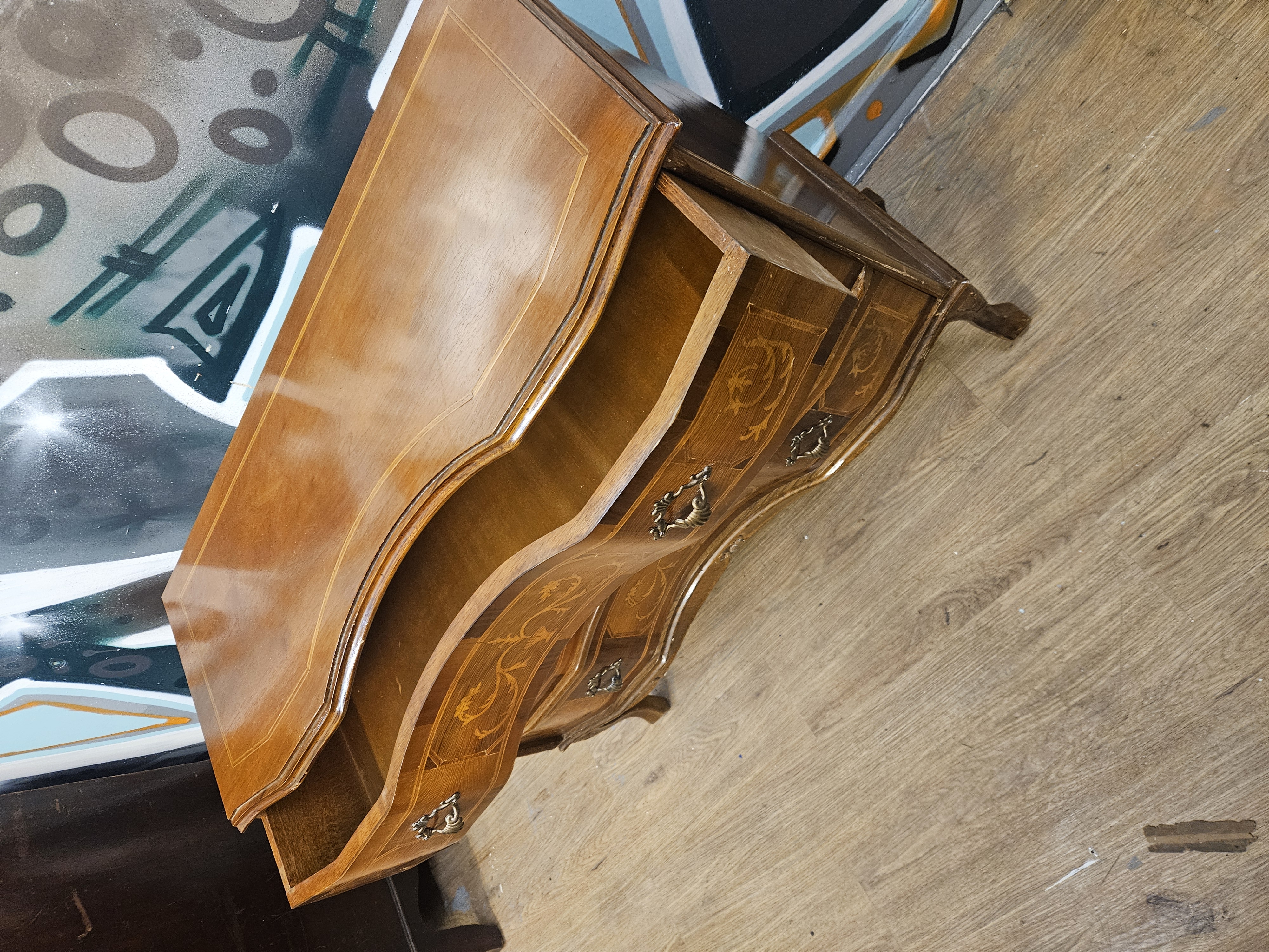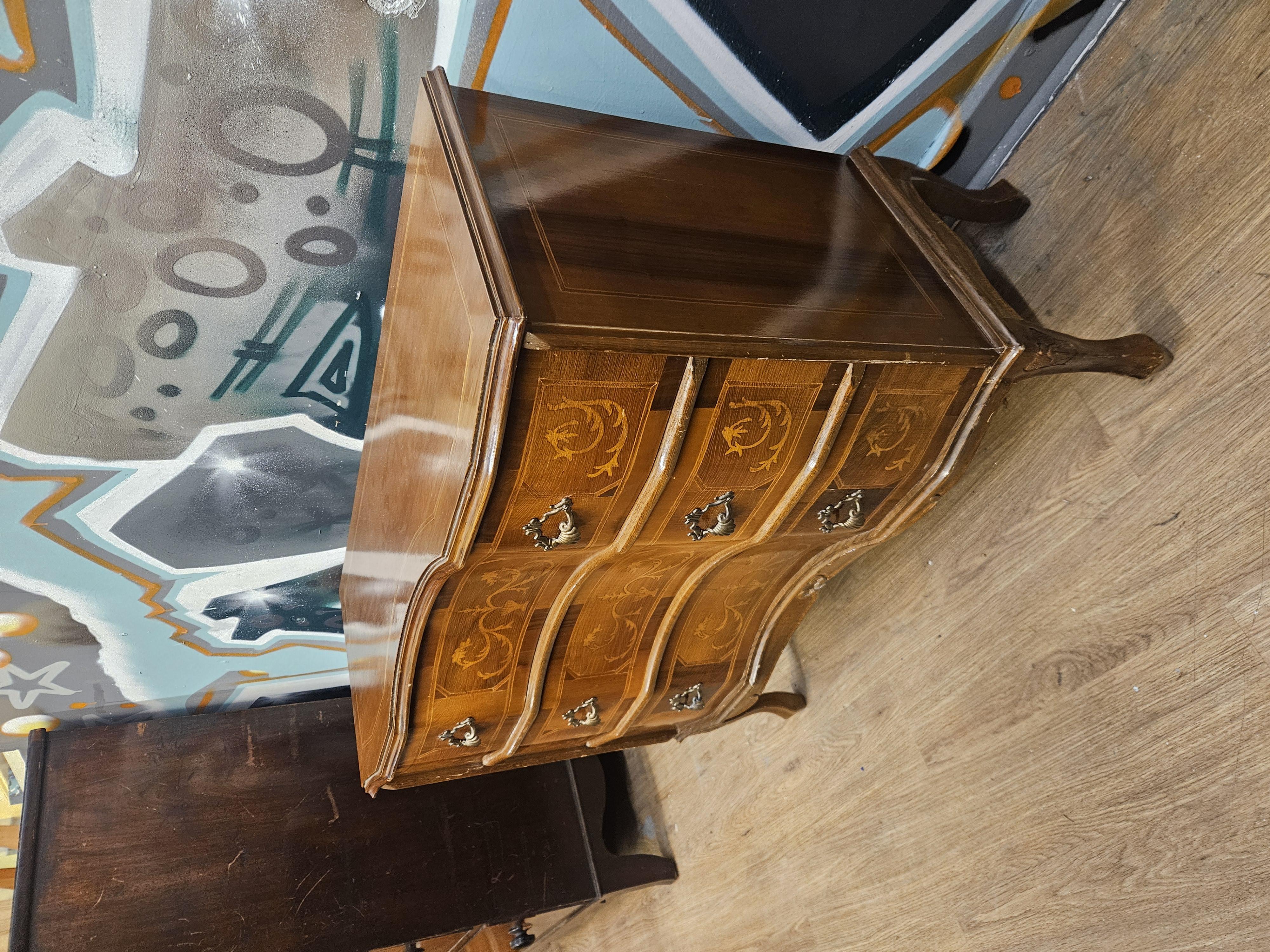 This small serpentine-fronted chest of drawers is a 20th-century reproduction in the Louis XV revival style. The primary finish consists of a warm-toned walnut veneer, with the three drawer fronts featuring scrolling floral marquetry in a contrasting lighter wood. The top surface is detailed with a rectangular inlaid stringing border. The structure features a pronounced bombe front and sides, terminating in four short cabriole legs. The secondary wood used for the drawer linings is a light-coloured softwood or plywood, consistent with modern machine production. Each drawer is fitted with two ornate, cast-metal swing handles with decorative backplates in a brass finish. No maker’s marks, labels, or stamps are visible on the exterior or interior of the piece.