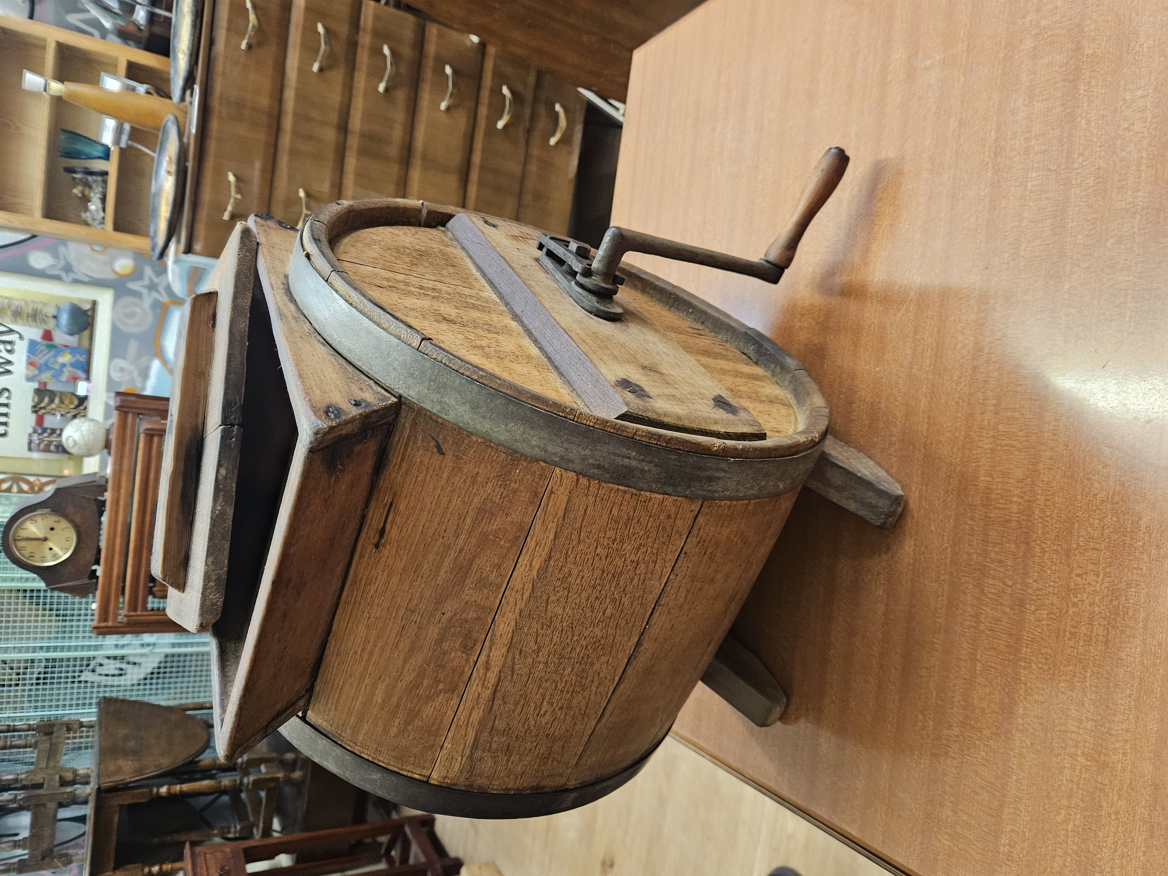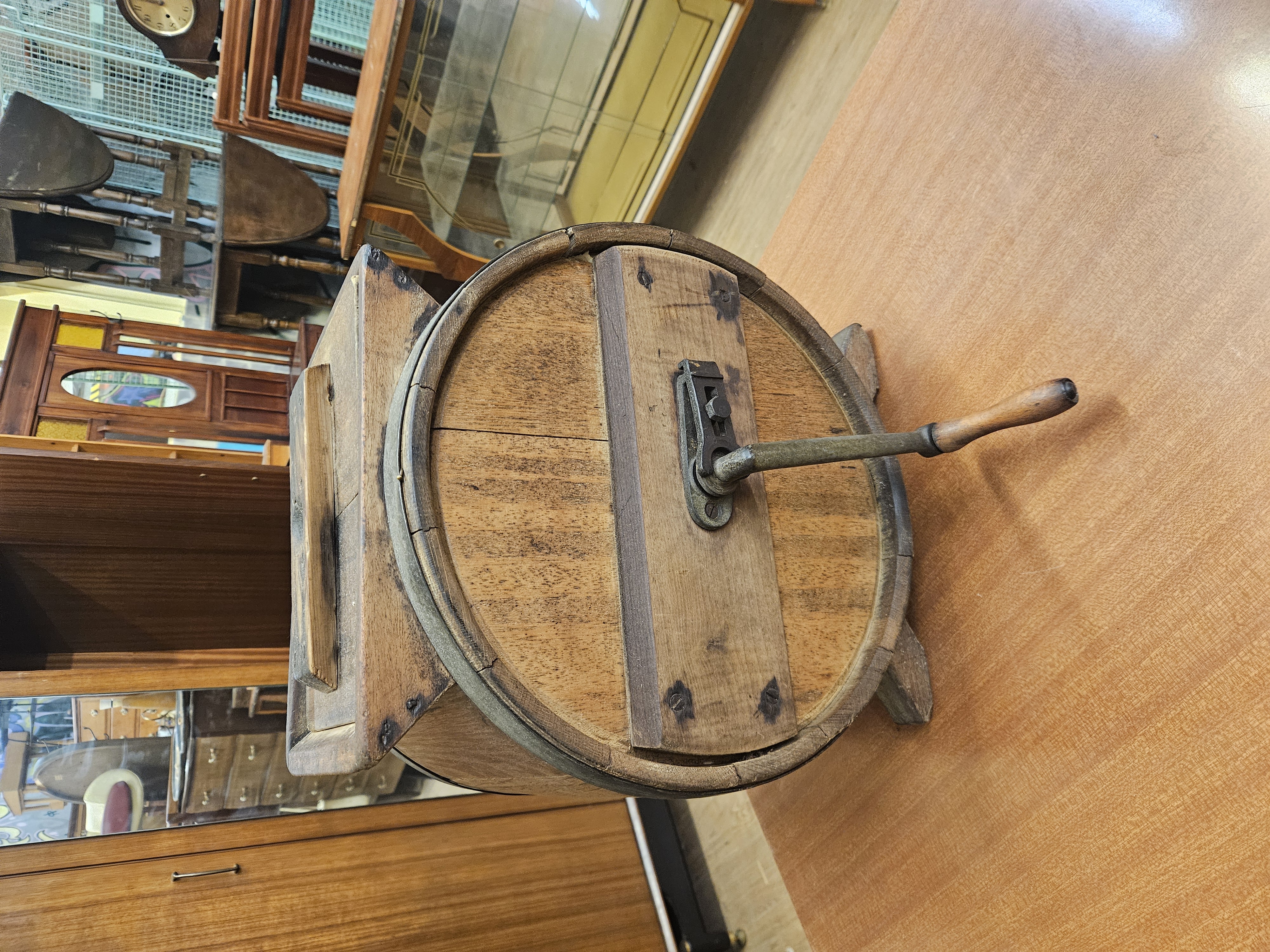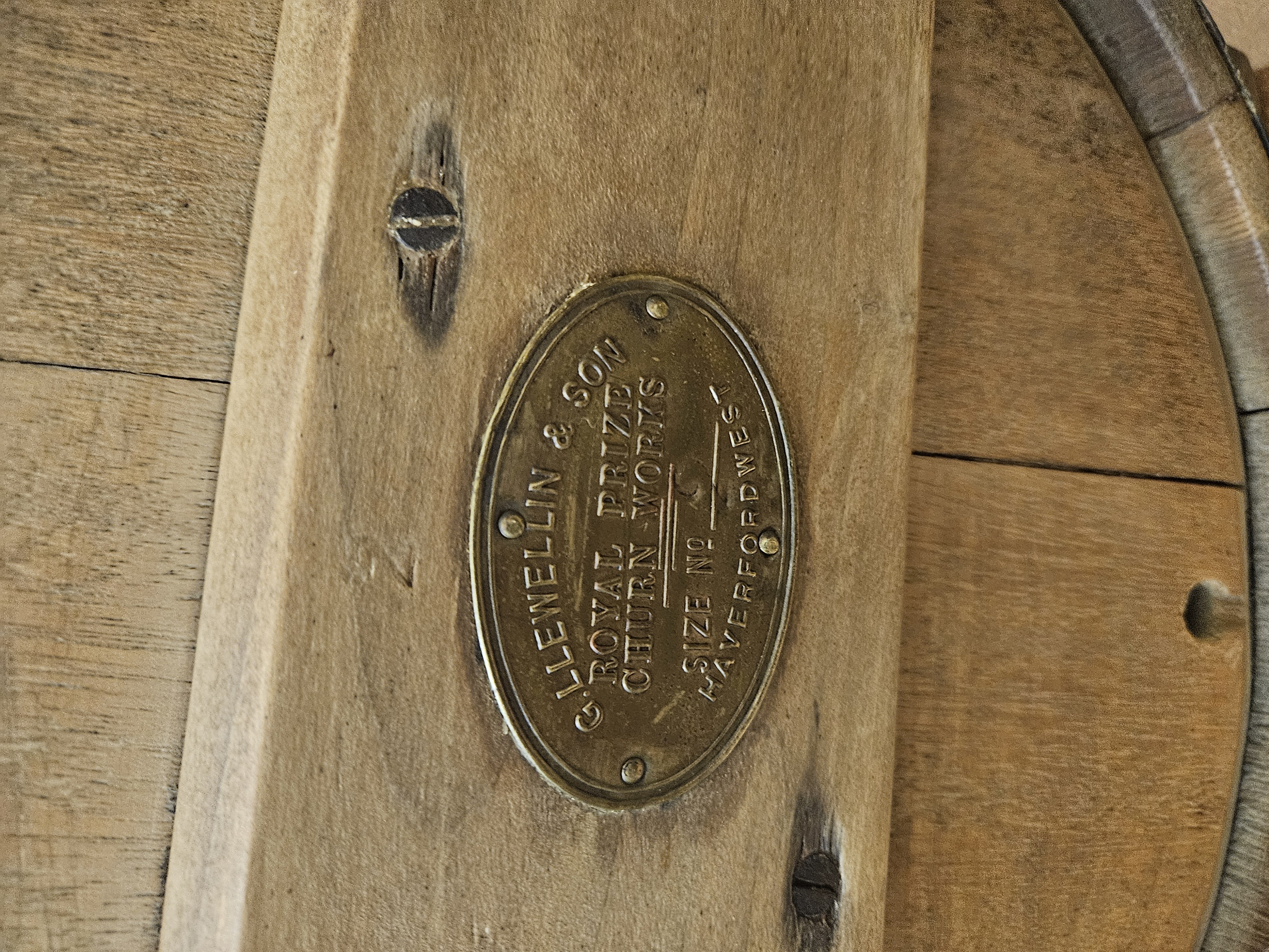 An antique barrel butter churn by G. Llewellin and Son of the Royal Prize Churn Works, Haverfordwest. The piece is constructed from wooden staves secured by metal hoops and rests on a fixed wooden trestle stand. It is equipped with a side-mounted metal hand crank with a turned wooden handle, which operates an internal wooden paddle agitator. The top of the barrel features a rectangular opening with a removable wooden lid. An oval brass maker’s plate is fixed to the end of the barrel and is embossed with the manufacturer’s details and location, with the size number field remaining blank.
