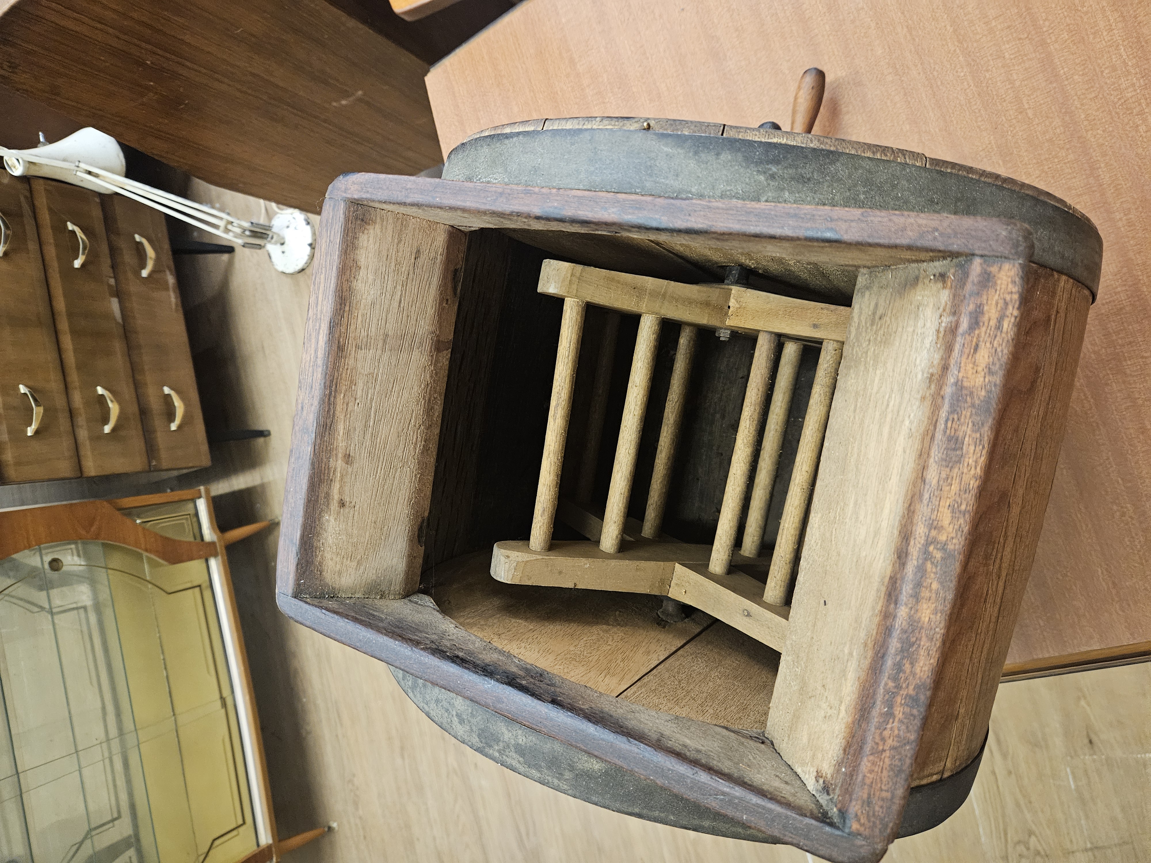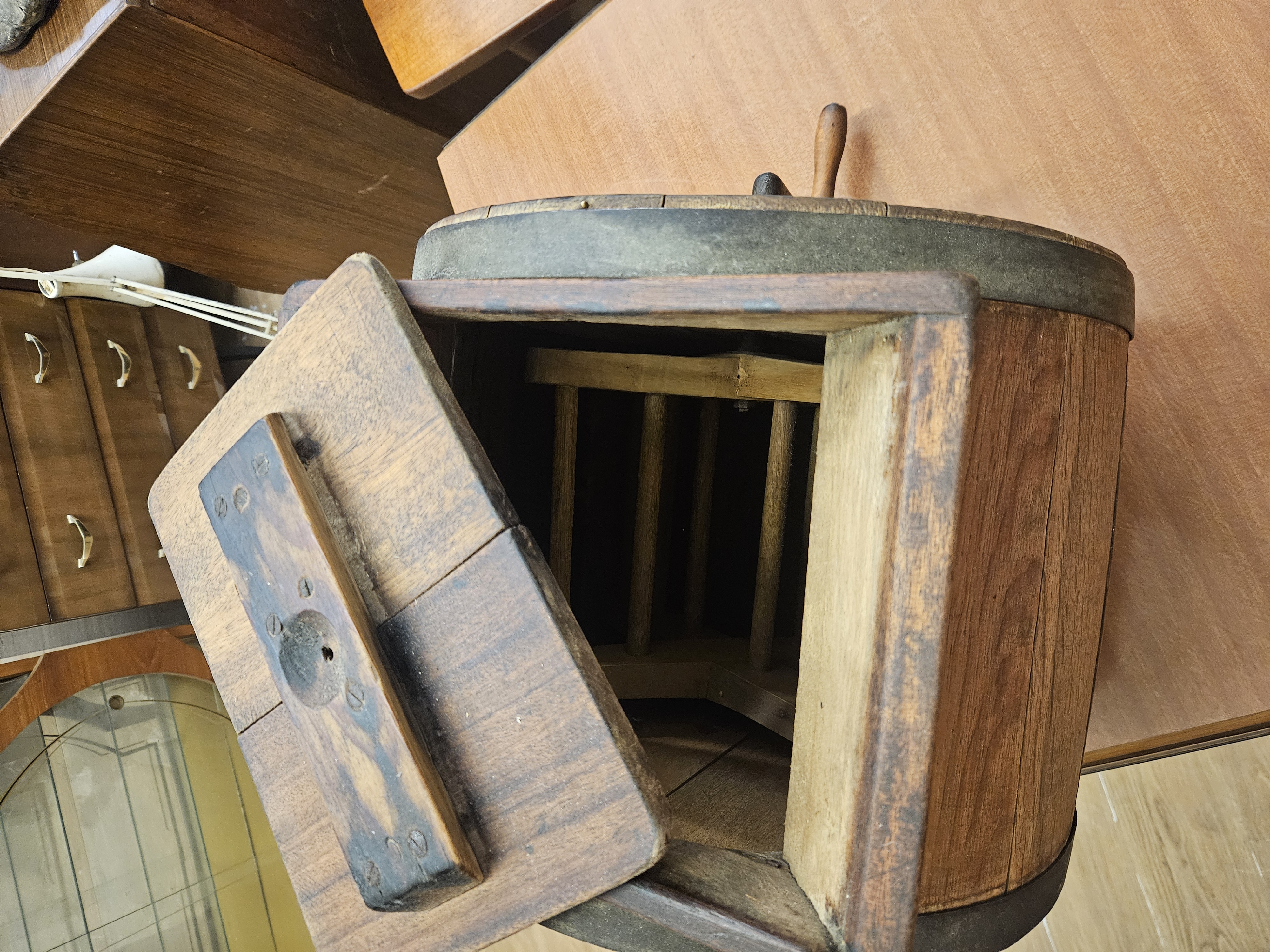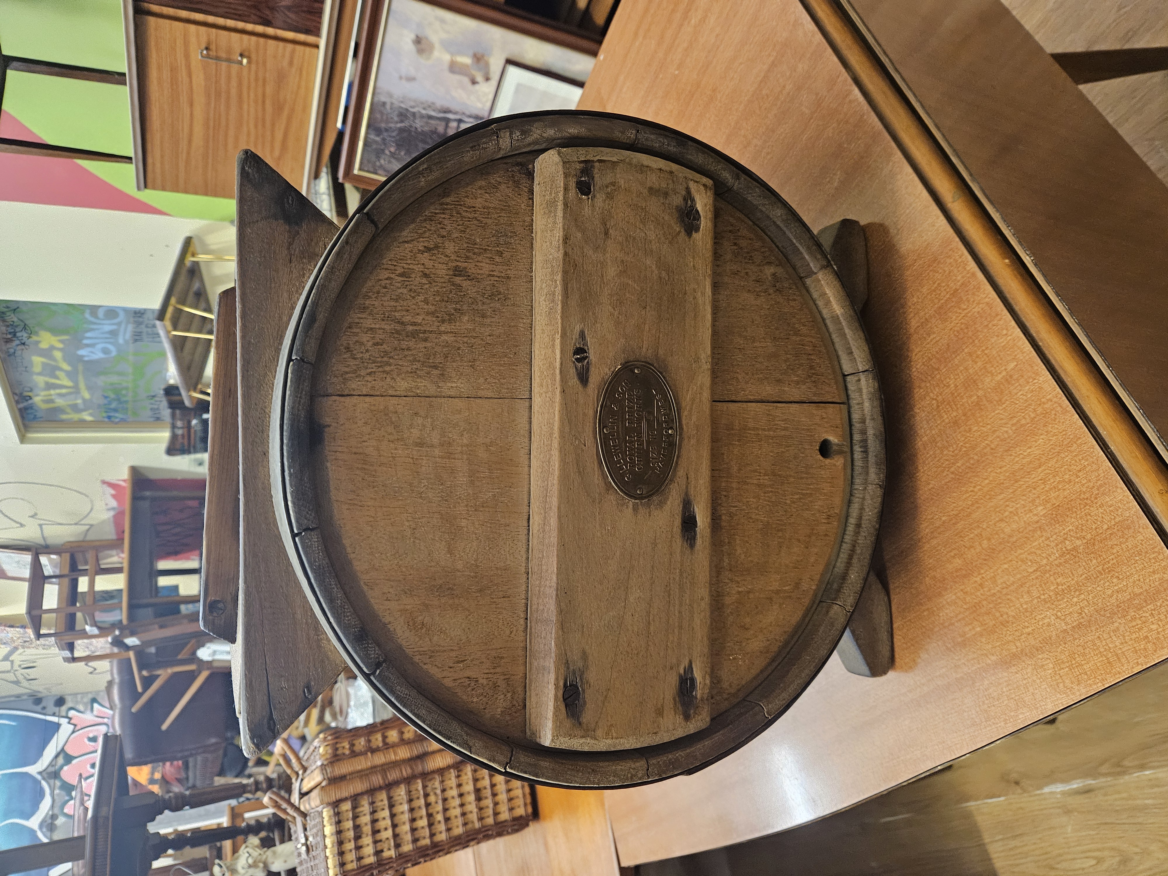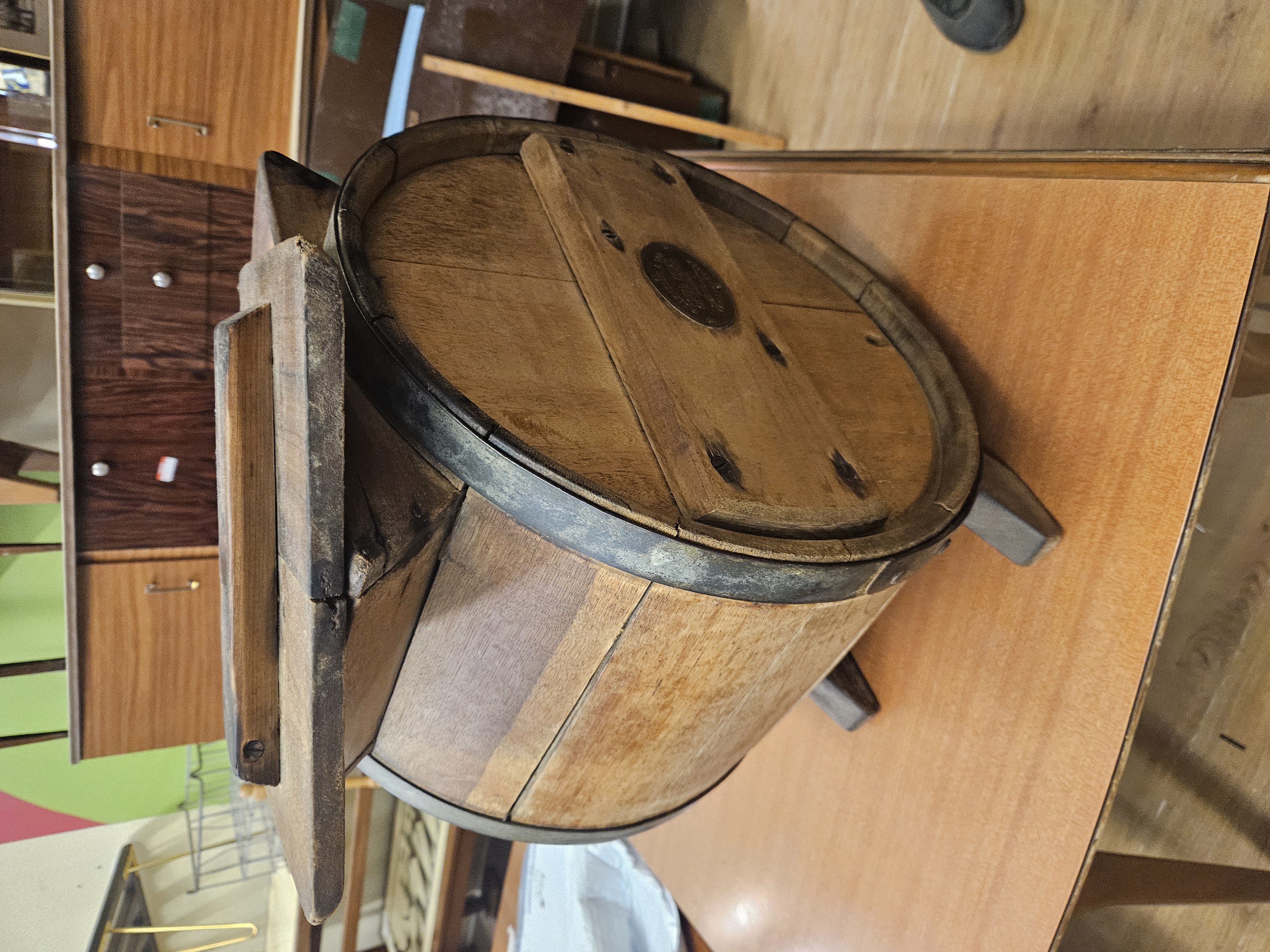 An antique barrel butter churn by G. Llewellin and Son of the Royal Prize Churn Works, Haverfordwest. The piece is constructed from wooden staves secured by metal hoops and rests on a fixed wooden trestle stand. It is equipped with a side-mounted metal hand crank with a turned wooden handle, which operates an internal wooden paddle agitator. The top of the barrel features a rectangular opening with a removable wooden lid. An oval brass maker’s plate is fixed to the end of the barrel and is embossed with the manufacturer’s details and location, with the size number field remaining blank.