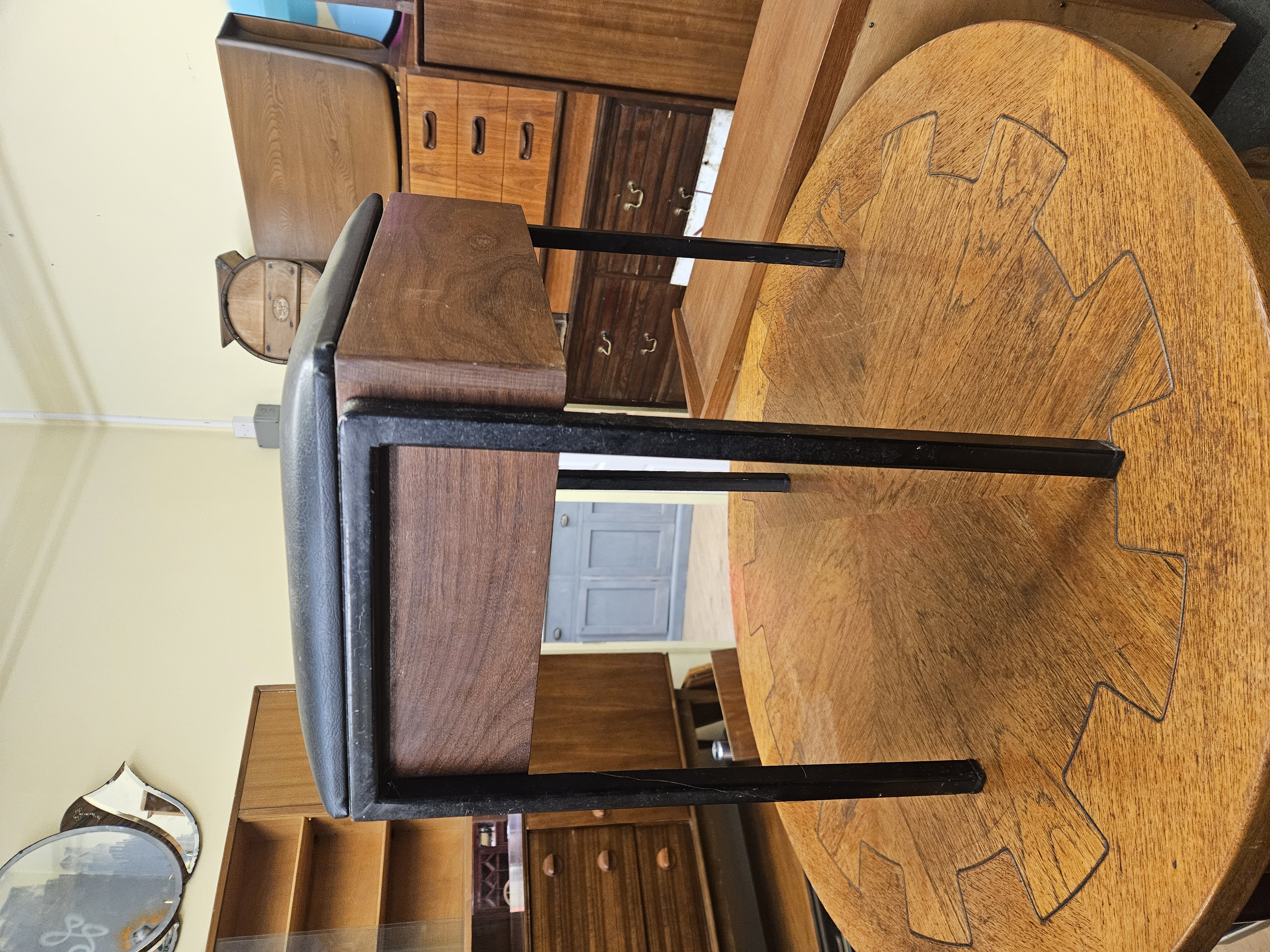 A mid-century modern storage stool, dating to the 1960s or 1970s. The piece features a rectangular wooden box constructed with wood veneer, showing a prominent grain. The box is supported by an integrated black-painted square-section metal frame which forms the four legs. The top consists of a fixed, padded seat upholstered in black vinyl. This upholstered lid is attached with a continuous metal hinge, opening to reveal a single internal storage compartment. The construction demonstrates a metal-to-wood assembly characteristic of industrial-influenced furniture from the period. No maker’s marks or labels are present on the item. The interior contains an assortment of sewing notions.