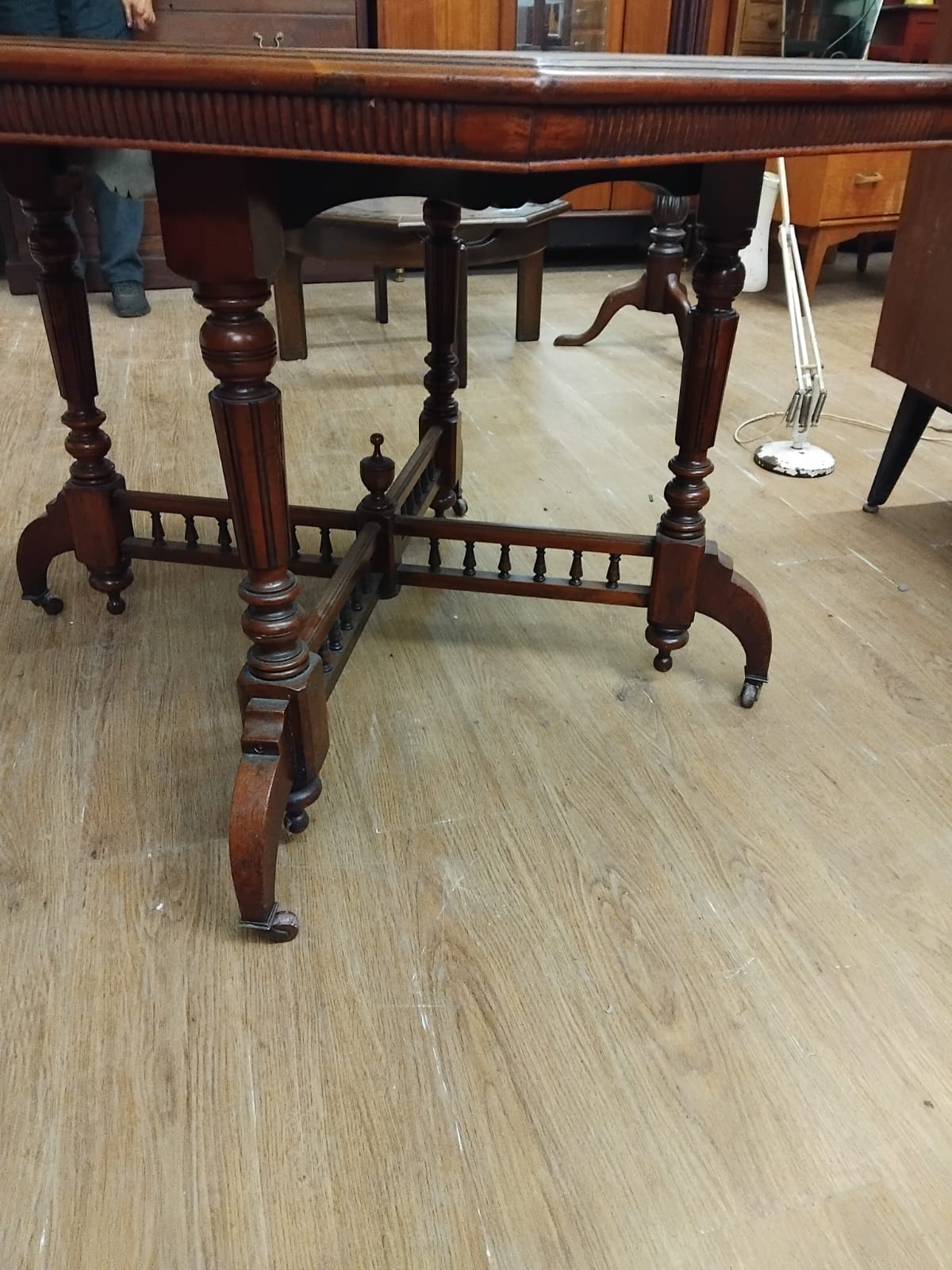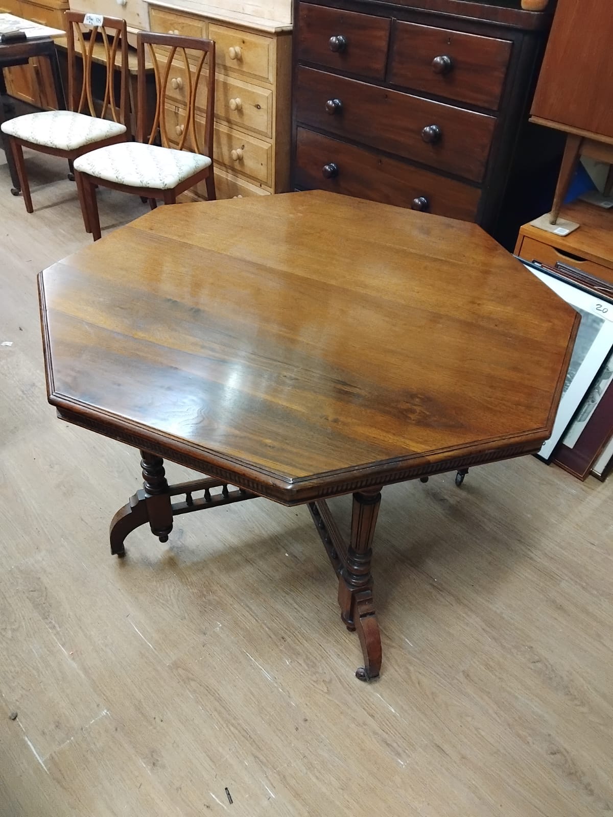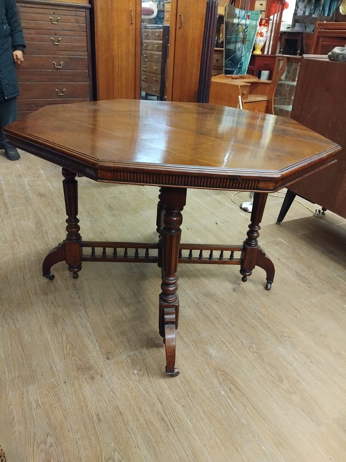 A late Victorian octagonal centre table constructed with a walnut-veneered top featuring a reeded edge. The base comprises four ring-turned and fluted supports, each ending in a splayed foot fitted with small castors. The legs are joined by an architectural X-frame stretcher featuring a spindle gallery and a central turned finial. This item is consistent with British furniture production from the late 19th century.