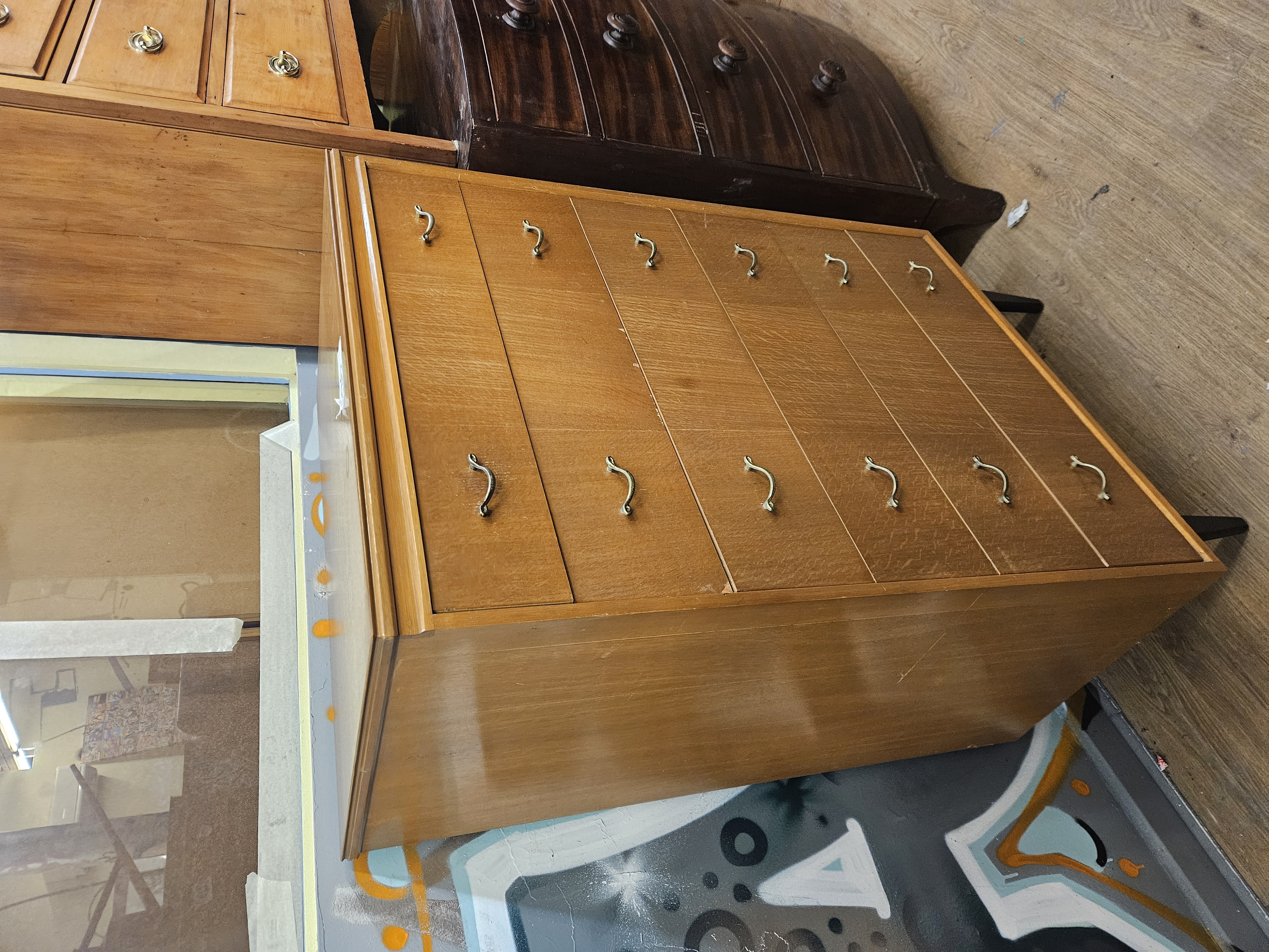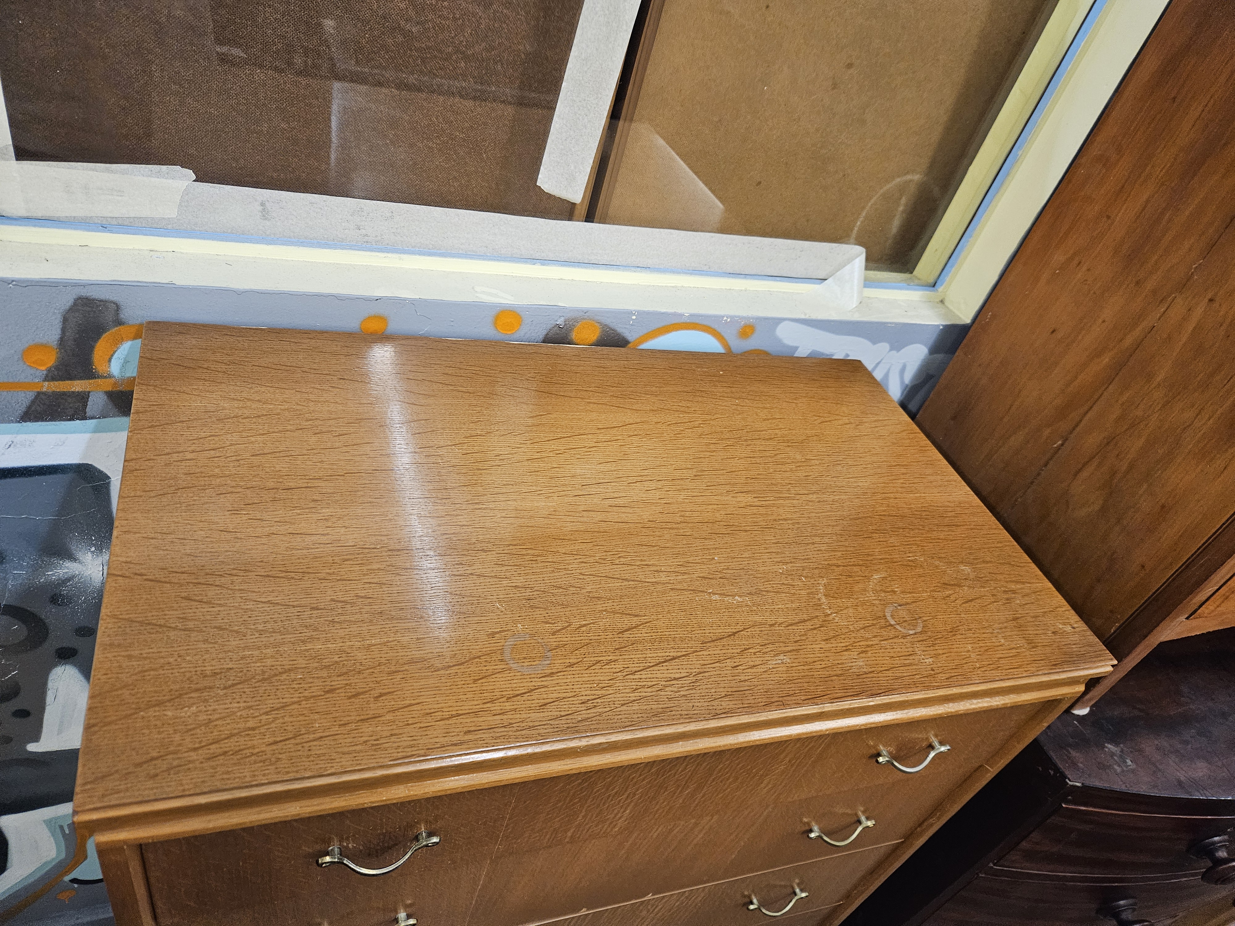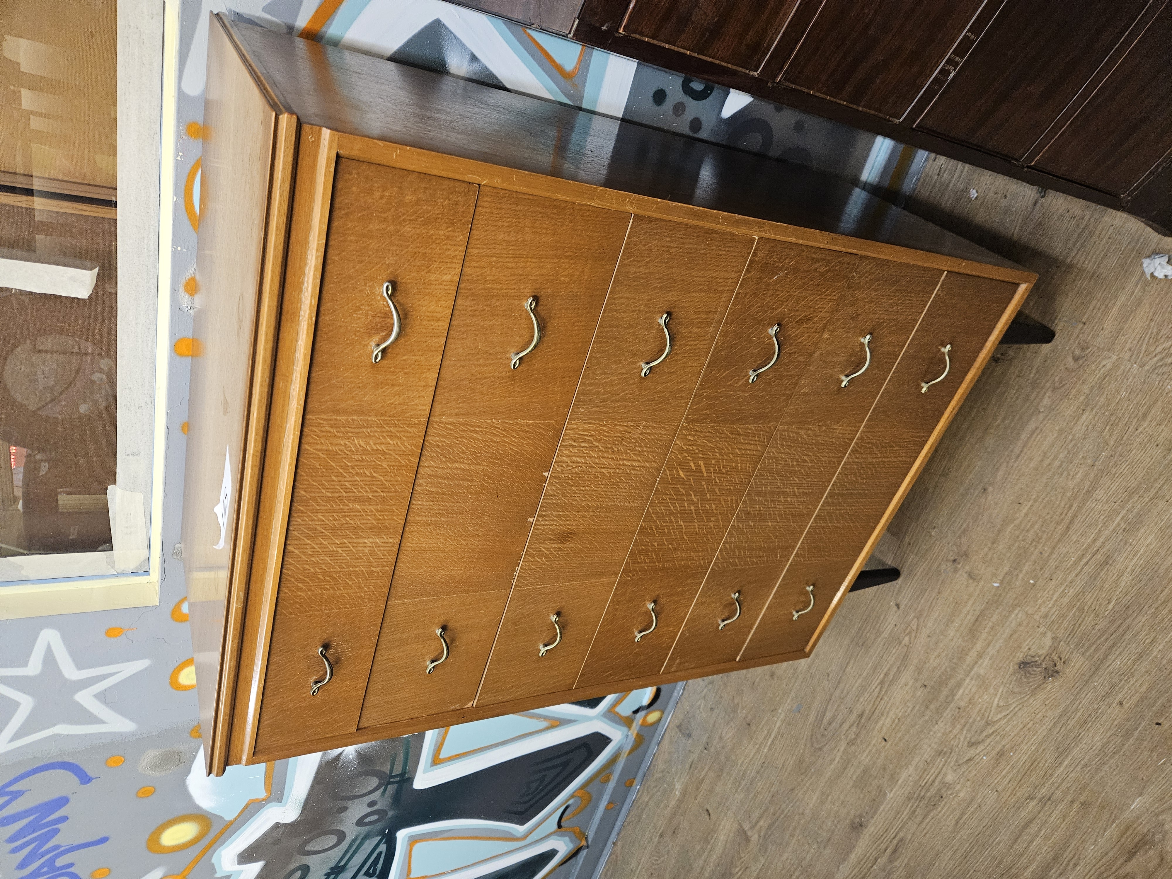A mid-century modern tall chest of drawers, dating to the mid-20th century, circa 1950s-1960s. The carcase features oak veneered exterior surfaces, with the six drawer fronts displaying a prominent ray-fleck grain characteristic of quarter-sawn oak. Each drawer front is fitted with two curved, brass-toned metal pull handles. The unit is supported on four short, dark-stained tapered wooden feet. The piece is designed in the mid-century modern style typical of British post-war furniture production. Internal drawer joinery is not visible in the provided images.
