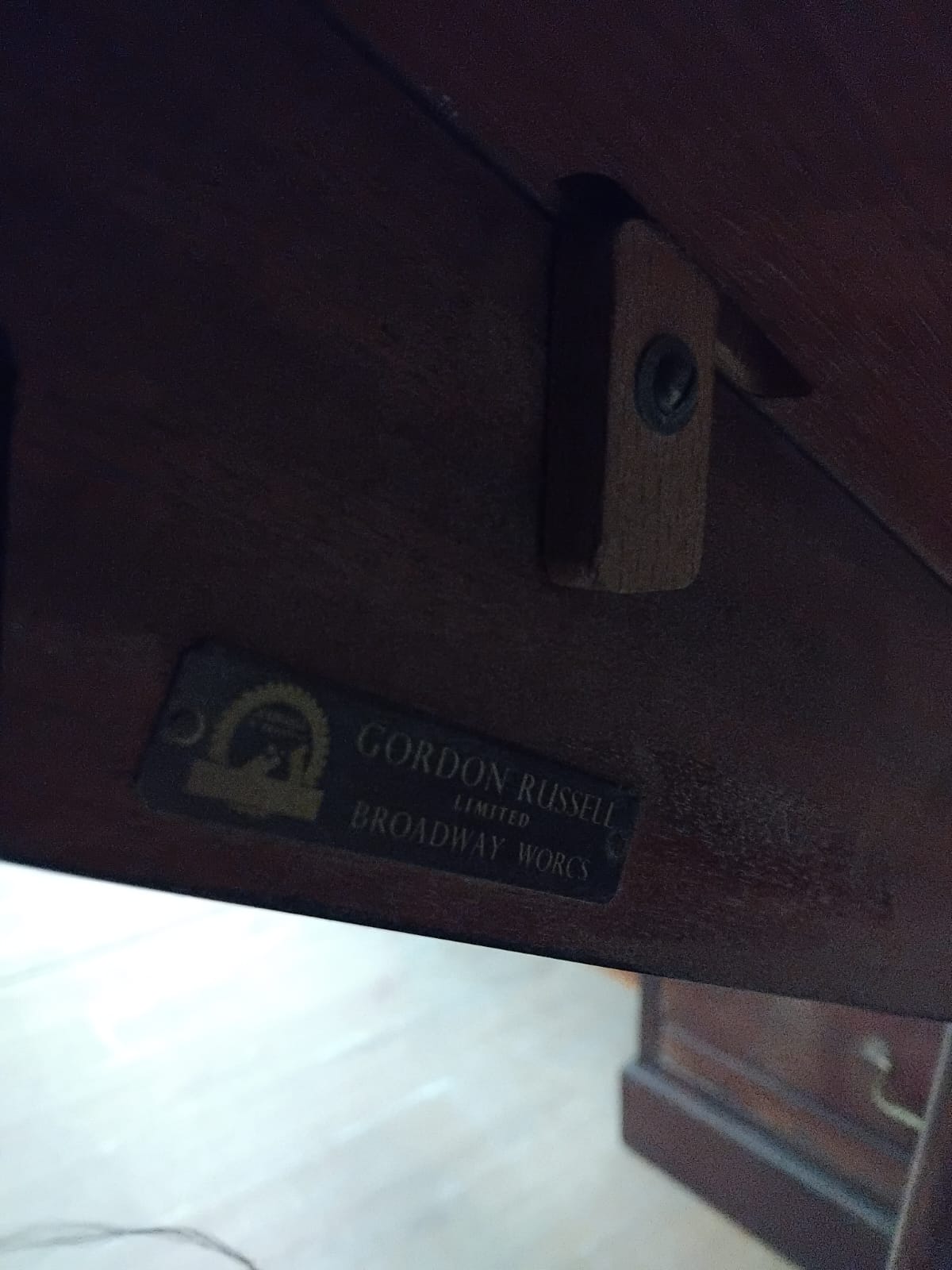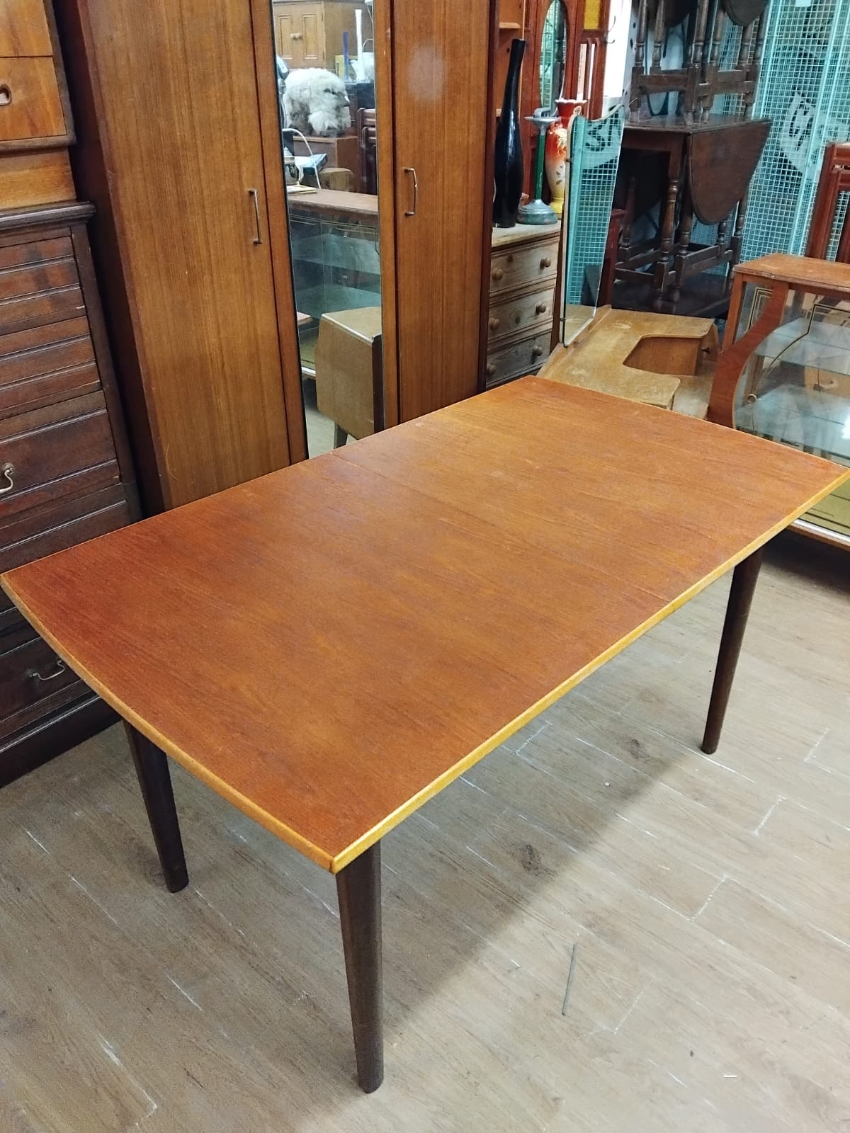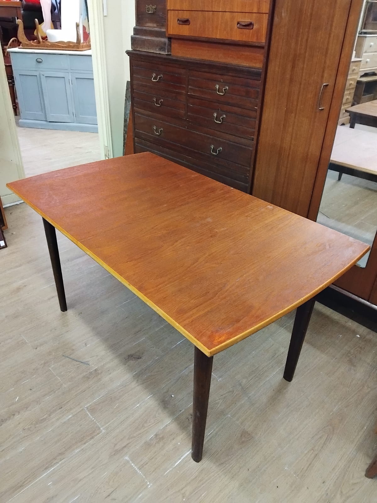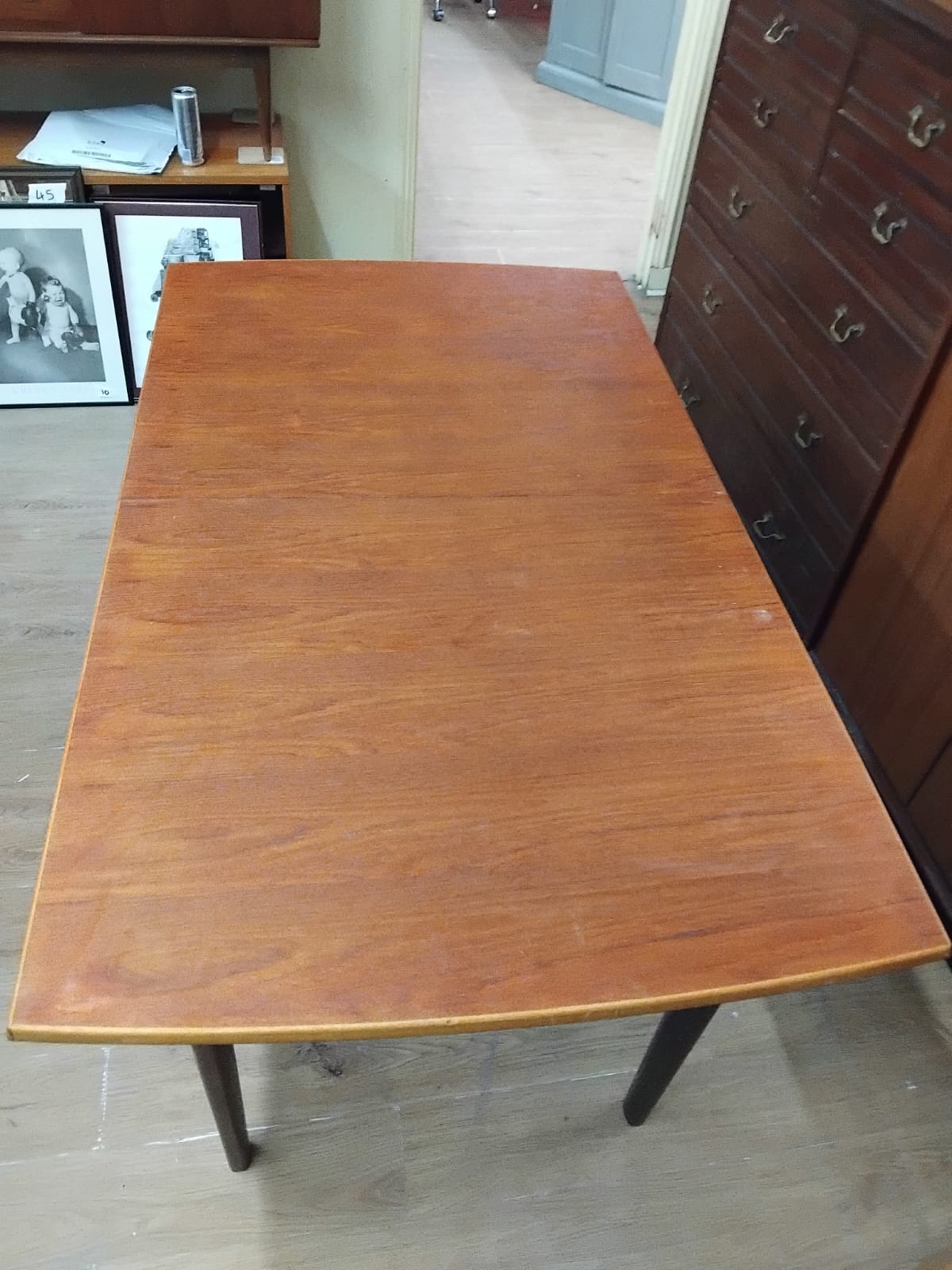 A Mid-Century Modern dining table manufactured by Gordon Russell Ltd of Broadway, Worcestershire. The piece features a rectangular top with slightly bowed ends, constructed with a teak veneer. The top is divided by a central seam, indicating an internal extending mechanism. The table is supported by four tapered, circular-section legs made of dark-stained hardwood. A metal manufacturer’s label is affixed to the underside, reading GORDON RUSSELL LIMITED BROADWAY WORCS.