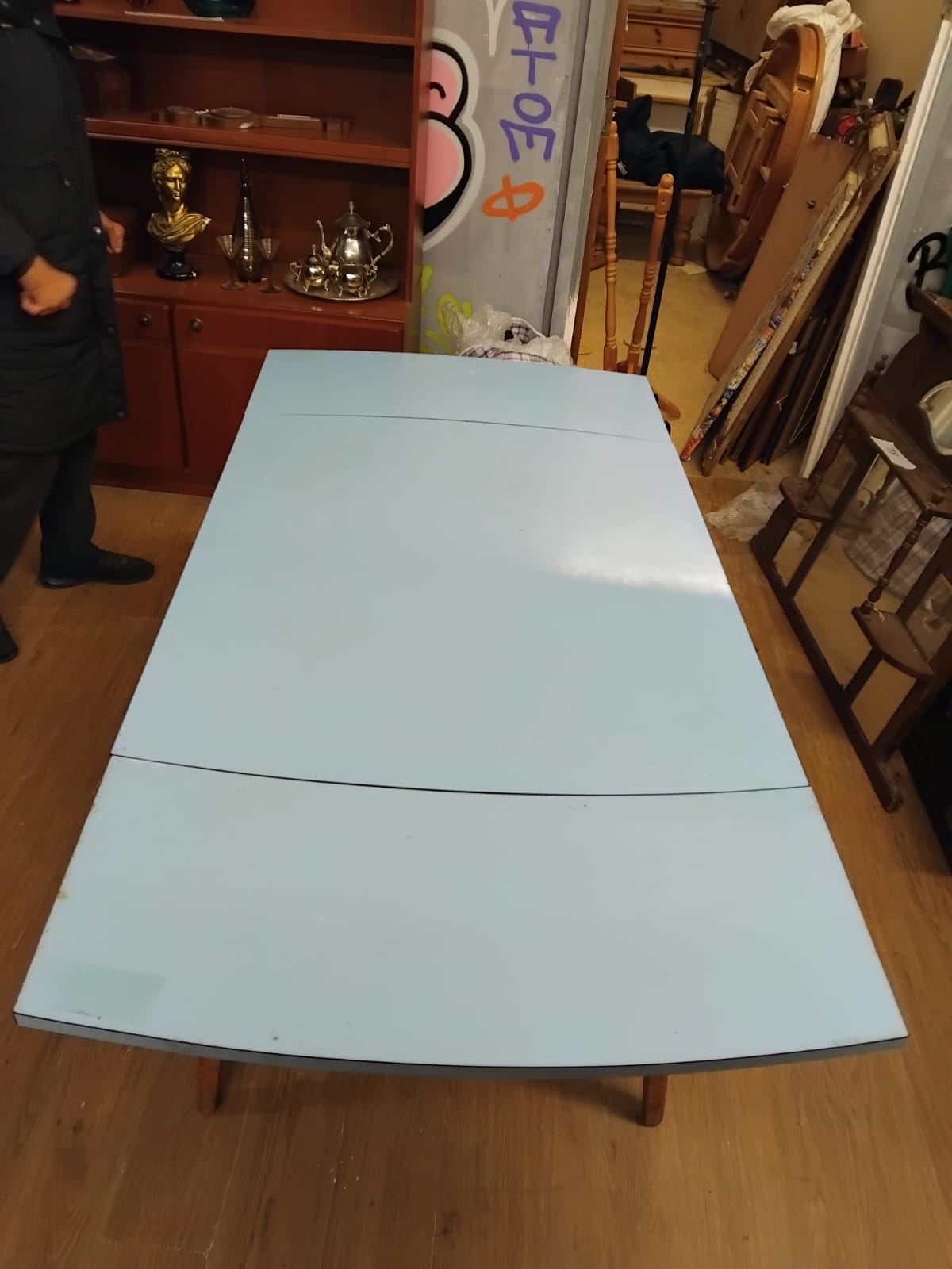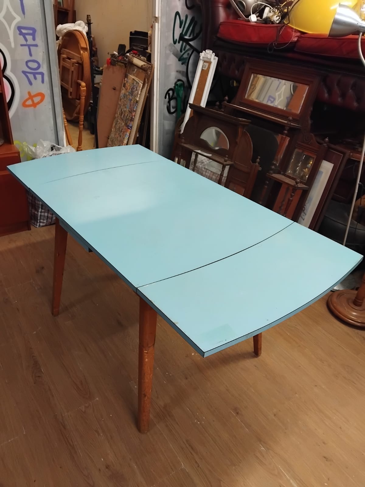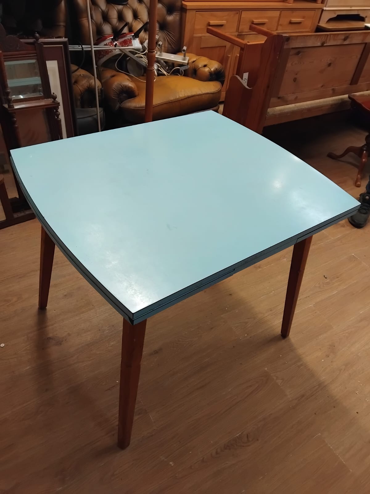 A mid-century modern extending kitchen table dating to the circa 1960s. The piece features a pale blue Formica laminate top set upon a wooden frame. It is constructed with a draw-leaf mechanism, incorporating two extension leaves that slide out from beneath the central square top. When fully extended, the table transitions from a square profile to a rectangular form with slightly curved outer edges. The structure is supported by four square-section tapered wooden legs, likely constructed from beech or a similar hardwood.