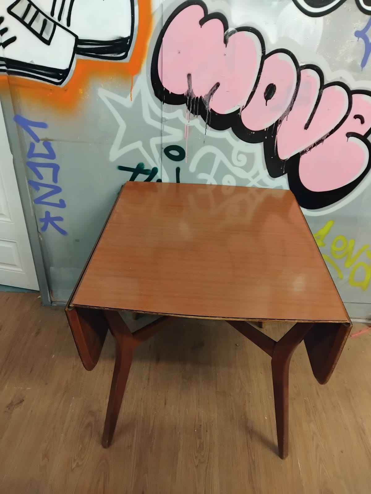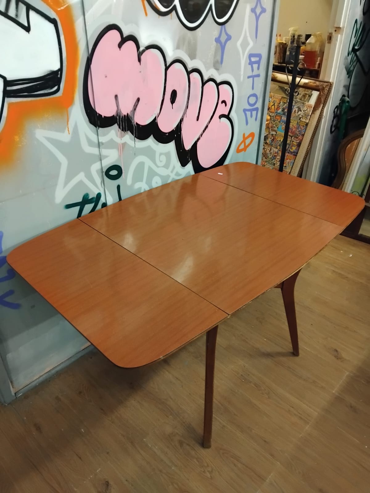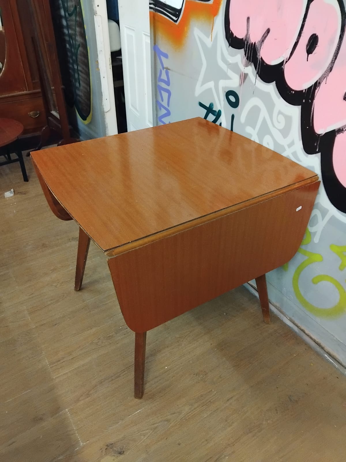 A mid-century modern drop-leaf dining table, dating from approximately the 1960s or 1970s. The construction features a wood-grain effect laminate or veneer surface over a composite core, set upon a solid wood base. The table is supported by four tapered legs, with two legs integrated into a gate-leg mechanism that swings out to support the two drop leaves. When fully extended, the tabletop forms a rectangular shape with rounded corners. The design is characteristic of British mid-century furniture production,